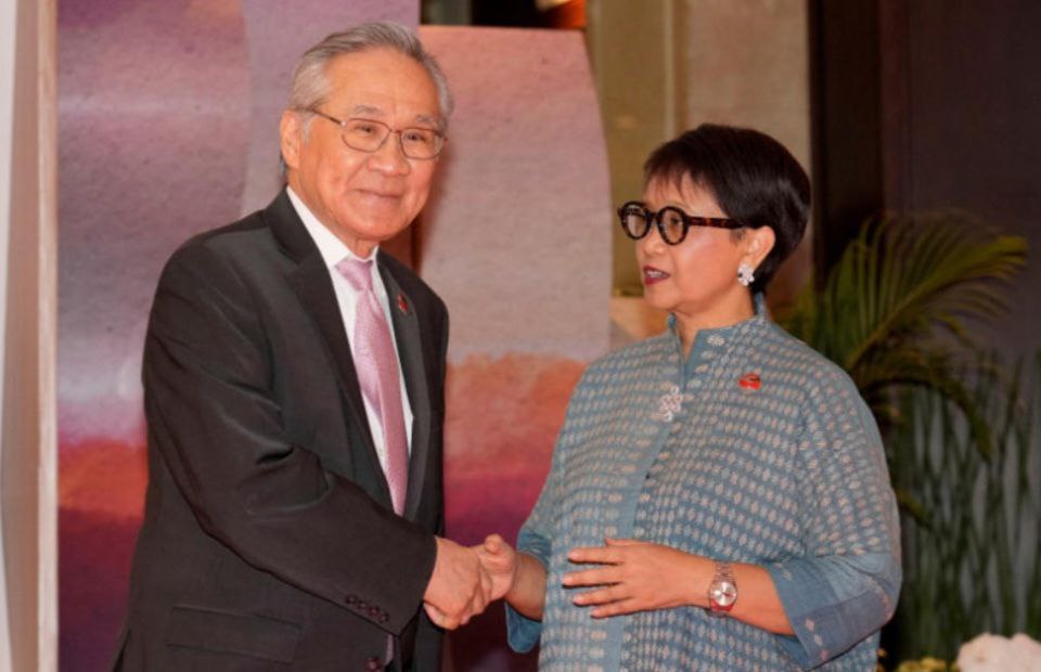 အင်ဒိုနီးရှားနိုင်ငံခြားရေးဝန်ကြီး ရတ်နို မာဆုဒီ အား ထိုင်းနိုင်ငံခြားရေးဝန်ကြီး ဒွန်ပရာမတ်ဝီနိုင် နှင့်အတူ အရှေ့တောင်အာရှနိုင်ငံများအသင်း အဖွဲ့ဝင်နိုင်ငံများ၏ နိုင်ငံခြားရေးဝန်ကြီးများ အစည်းအဝေး ပြုလုပ်မည့် အင်ဒိုနီးရှားနိုင်ငံ၊ ဂျာကာတာမြို့ရှိ ရှန်ဂရီလာဟိုတယ်တွင် ဇူလိုင်လ ၁၁ ရက်က တွေ့ရစဉ်