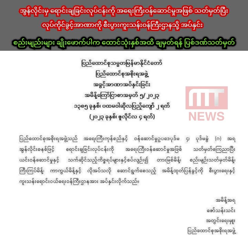 စည်းမျည်းများ ချိုးဖောက်ပါက ထောင်သုံးနှစ်အထိ ချမှတ်ရန် ပြစ်ဒဏ်သတ်မှတ်