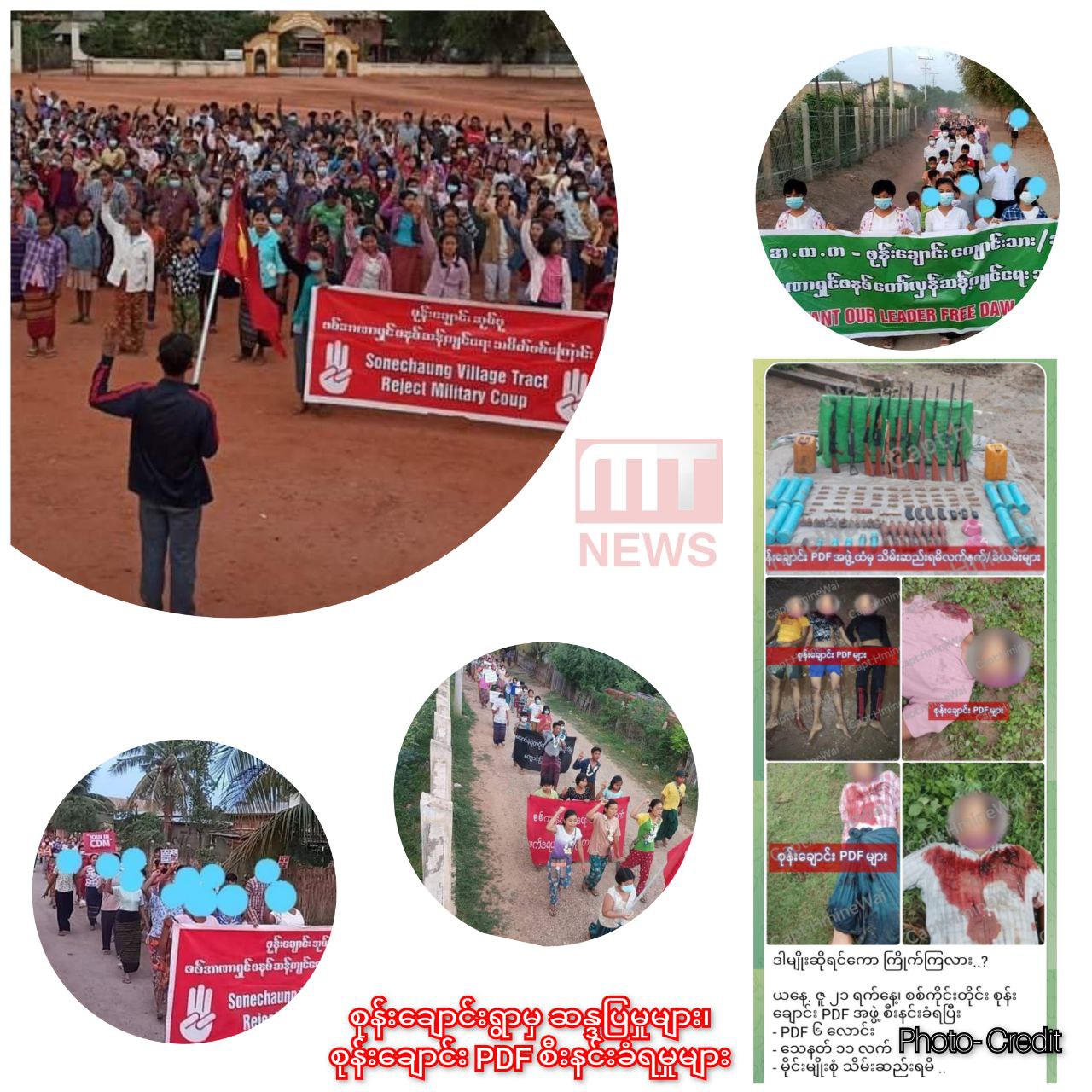 စစ်ကိုင်းတိုင်း၊ ယင်းမာပင်မြို့နယ်၊ စုန်းချောင်းရွာအခြေပြု PDF စခန်းကို ဒီနေ့မနက်အစောပိုင်းမှာ စစ်ကြောင်းထိုး ရှင်းလင်းခံလိုက်ရတာကြောင့် PDF ၆ ဦးထက်မနည်း သေဆုံးခဲ့တယ်လို့ ဒေသခံအချို့ထံက ကနဦးသတင်းတွေအရ စုံစမ်းသိရပါတယ်။