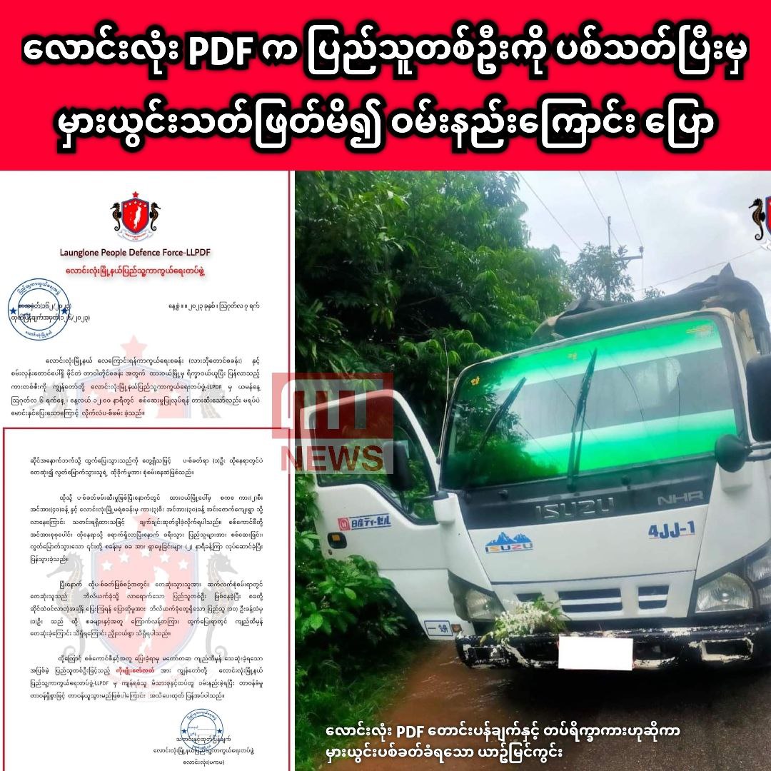 NUG ဩဇာခံ လောင်းလုံးမြို့နယ် ပြည်သူ့ကာကွယ်ရေးတပ်ဖွဲ့ (LLPDF) က ပြည်သူတစ်ဦးကို ပစ်သတ်လိုက်ပြီး မှားယွင်းသတ်ဖြတ်မိကြောင်း တောင်းပန်စာထုတ်ပြန်ထားသည်။