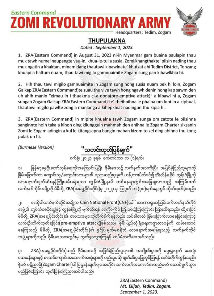 မြန်မာ့နွေဦးတော်လှန်ရေးကိုအကြောင်းပြပြီး ဇိုမီးဒေသမှာ လက်နက်အားကိုးနဲ့ အပြစ်မဲ့ပြည်သူတွေကို ခြိမ်းခြောက် ကျောင်းသူ/ကျောင်းသားတွေရဲ့ ပညာဆည်းပူးမှုကို ဟန့်တားပိတ်ပင်ပြီး တီးတိန်ခရိုင်၊ တွန်းဇံမြို့ကို လာရောက်ဖျက်ဆီးဖို့ကြိုးပမ်းနေတဲ့ တွန်းဇံ PDF လက်နက်ကိုင်တချို့စခန်းကို ZRA(အရှေ့ပိုင်းတိုင်း)က ဩဂုတ် ၃၁ ရက်မှာ တိုက်ထုတ်ခဲ့တယ်လို့ Zomi Revolutionary Army ထုတ်ပြန်ချက်နဲ့ ဒေသတွင်းသတင်းတွေက ဖော်ပြပါတယ်။