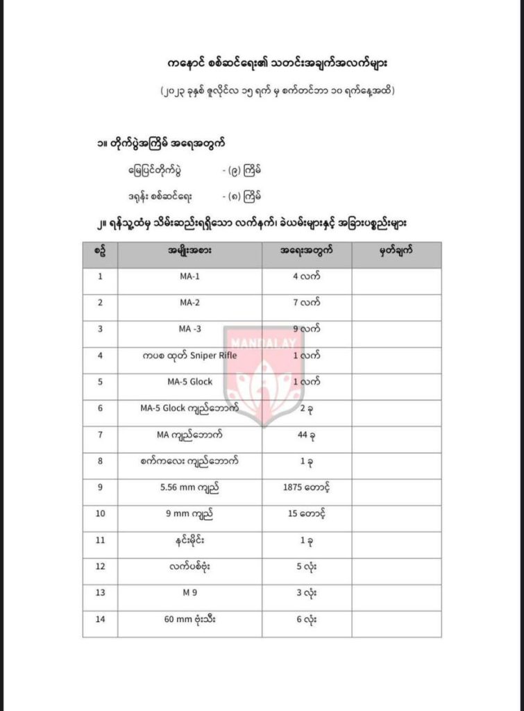 PDF မန္တလေး ဖော်ဆောင်နေသော “ ကနောင် စစ်ဆင်ရေး ” သည် ပြီးဆုံးခြင်းမရှိသေးဘဲ လက်ရှိတွင်လည်း လခရတပ်များဖြစ်သည့် တပ်မ (၉၉) ၊ တပ်(၁၀၁) လက်အောက်ခံ (ခလရ ၂၅၂၊ ခလရ ၂၅၇) နှင့် စကခ-၁ လက်အောက်ခံ ခမရ (၅၀၂) တို့မှ အင်အား (၄၀၀) ဝန်းကျင်ခန့်ဖြင့် ထိပ်တိုက်ဆိုင်ထားကာ စစ်ရေးတင်းမာလျှက်ရှိသည်ဟုလည်း ဖော်ပြထားသည်။