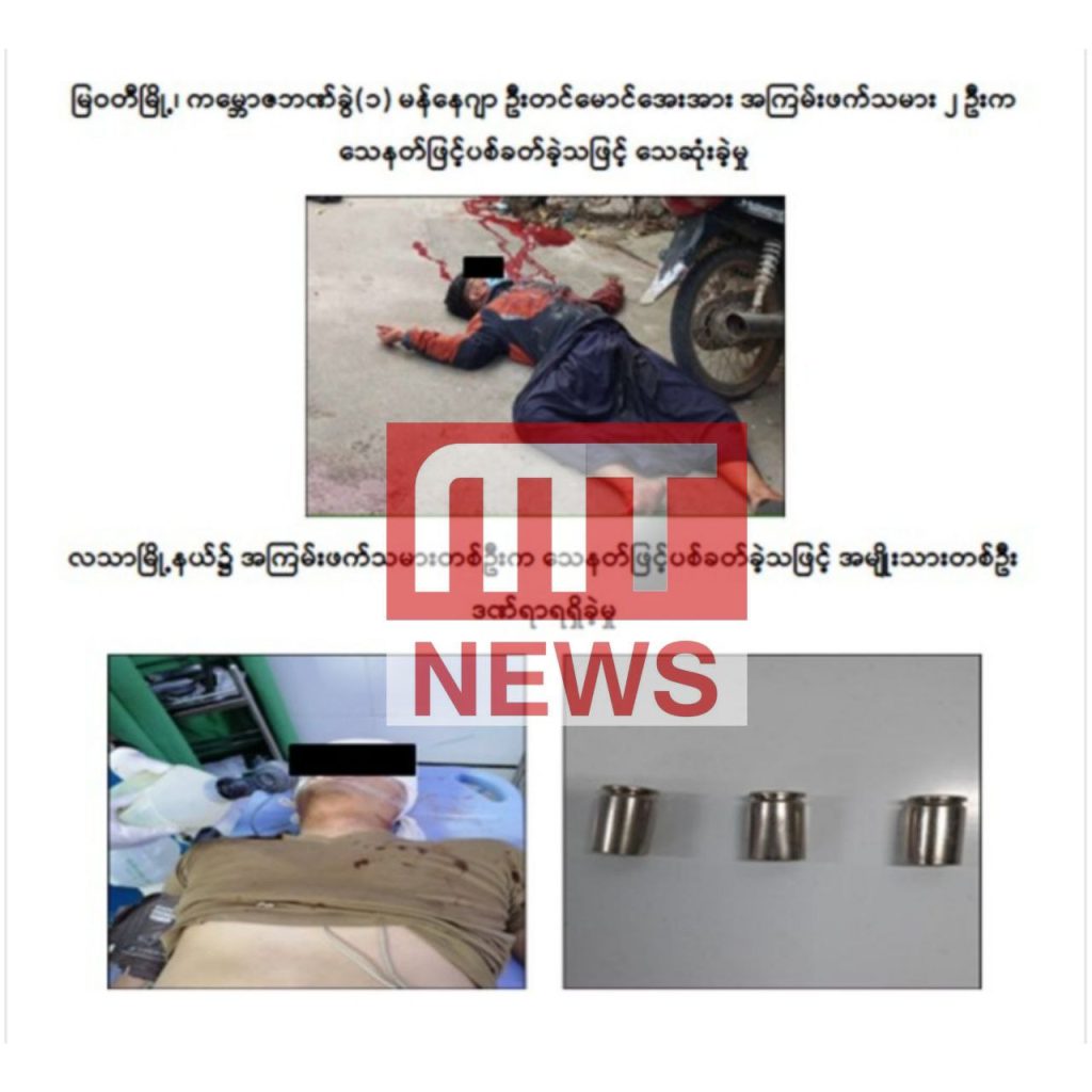ထို့အတူ ညနေ ၅ နာရီ ၁၅ မိနစ်အချိန်တွင် ကရင်ပြည်နယ်၊ မြဝတီမြို့၊ အမှတ်(၄) ရပ်ကွက်နေ မြဝတီမြို့၊ ကမ္ဘောဇဘဏ်ခွဲ(၁)မှ မန်နေဂျာဖြစ်သူ ဦးတင်မောင်အေး(၄၃)နှစ်သည် ၎င်းအလုပ်လုပ်ကိုင်သည် ကမ္ဘောဇဘဏ်ခွဲ(၁)မှ နေအိမ်သို့ တစ်ဦးတည်းဆိုင်ကယ်ဖြင့်ပြန်လာစဉ် အမှတ်(၄)ရပ်ကွက်၊ မေတ္တာ(၃)လမ်းထိပ်အရောက်၌ ၎င်း၏အနောက်မှ ဆိုင်ကယ်တစ်စီးဖြင့် လိုက်ပါလာသည့် အကြမ်းဖက်သူအမျိုးသား ၂ ဦး(စိစစ်ဆဲ)က သေနတ်ဖြင့်ပစ်ခတ်ကာ ထွက်ပြေးသွားခဲ့သဖြင့် ဦးတင်မောင်အေးတွင် ဝဲနားအောက်ကျည်ဖောက်ဝင်ဒဏ်ရာ ၃ ချက်၊ ယာပါးကျည်ဖောက်ထွက်ဒဏ်ရာ ၁ ချက်တို့ဖြင့် အခင်းဖြစ်နေရာ၌ သေဆုံးခဲ့ကြောင်း သိရသည်။