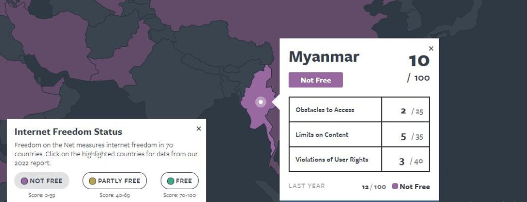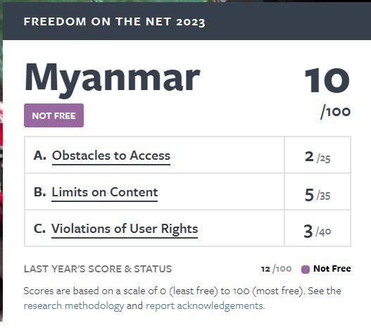 မြန်မာနိုင်ငံသည် ပြီးခဲ့သော ၂၀၂၂ ခုနှစ်က အင်တာနက်လွတ်လပ်ခွင့်နှင့်ပတ်သက်ပြီး သတ်မှတ်ထားသော အမှတ်ပေါင်း ၁၀၀ ထဲတွင် ၁၂ မှတ်ရရှိခဲ့သော်လည်း ၂၀၂၃ ခုနှစ်တွင် ၁၀ မှတ်သာရရှိခဲ့ပြီး အင်တာနက်လွတ်လပ်ခွင့်မရှိသော နိုင်ငံများ၏ ထိပ်ဆုံးနိုင်ငံများစာရင်းတွင် ဒုတိယနေရာ၌ ရှိနေခဲ့ကြောင်း သိရသည်။ Freedom on the Net ၏ အစီရင်ခံစာတွင် တရုတ်နိုင်ငံသည် ၉ မှတ်သာရရှိခဲ့ပြီး ကမ္ဘာပေါ်တွင် အင်တာနက်လွတ်လပ်ခွင့်မရှိသော အဆိုးဆုံးနိုင်ငံအဖြစ် သတ်မှတ်ခံရကြောင်း သိရသည်။