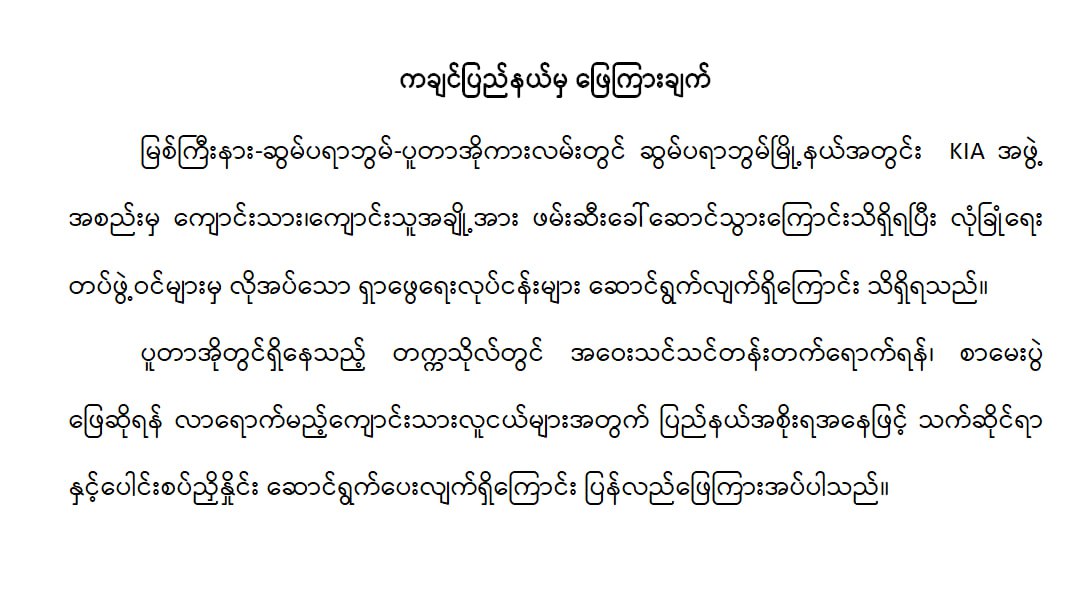 ပူတာအိုခရိုင်မှ တက္ကသိုလ်ကျောင်းသူ/ကျောင်းသား ၃၅ ဦးခန့်ကို ဆွမ်ပရာဘွန်မြို့အကျော် ခတ်ခရားယံ တစ်နေရာတွင် KIO/KIA က အကြောင်းမဲ့ ဖမ်းဆီးချုပ်နှောင်ထားကြောင်း သိရရှိသဖြင့် SAC သတင်းထုတ်ပြန်ရေးအဖွဲ့သို့ မေးမြန်းမှုကို အထက်ပါအတိုင်း ပြန်လည်ဖြေကြားခဲ့ခြင်းဖြစ်သည်။