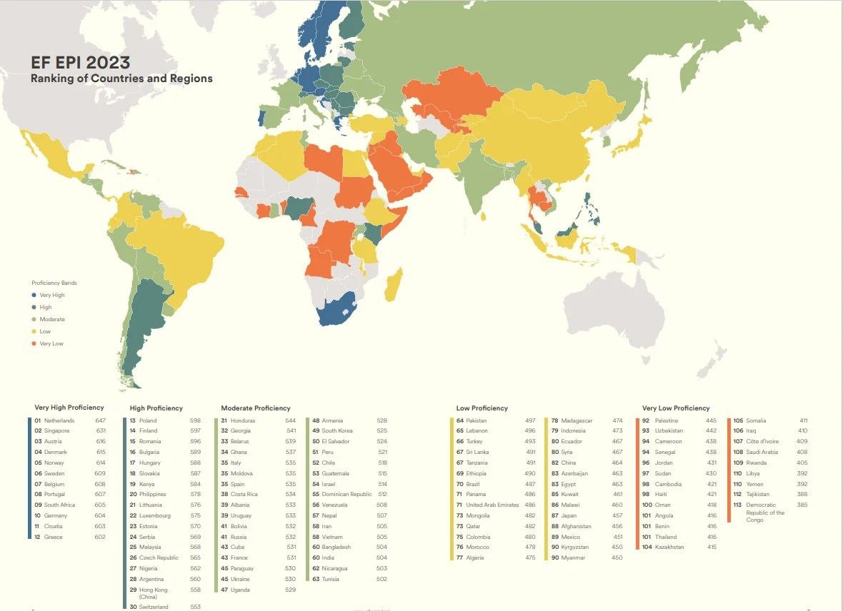 အဆိုပါအဖွဲ့သည် ကမ္ဘာတဝှမ်းရှိ နိုင်ငံဒေသပေါင်း ၁၁၃ နိုင်ငံမှ အရွယ်ရောက်ပြီးသား လူပေါင်း၂ ဒသမ ၂ သန်းကျော်ကို အင်္ဂလိပ်စာနှင့်ပတ်သက်ပြီး စမ်းသပ်စစ်ဆေးခဲ့ပြီးနောက် အမှတ်ပေးကာ ၂၀၂၃ ခုနှစ်အတွက် အင်္ဂလိပ်စာ ကျွမ်းကျင်မှုအဆင့်အညွှန်းကိန်း ကမ္ဘာ့အဆင့်သတ်မှတ်ခဲ့ရာ မြန်မာနိုင်ငံက ကမ္ဘာ့နိုင်ငံပေါင်း ၁၁၃ နိုင်ငံထဲတွင် ကာဂျစ္စတန်နိုင်ငံနှင့်အတူ အဆင့် ၉၀ နေရာရပ်တည်နေကြောင်း သိရသည်။