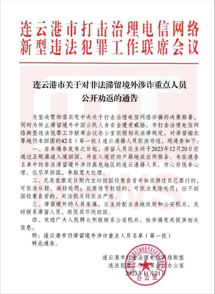 ပြည်ပနိုင်ငံတွင် တရားမဝင်နေထိုင်နေပြီး အွန်လိုင်းမှတစ်ဆင့်လိမ်လည်မှုကျူးလွန်နေသည့်ဂိုဏ်းများတွင်ပါဝင်ဆက်နွှယ်နေသည့် တရုတ်နိုင်ငံသား ၄၂ ဦးကို ပထမအသုတ်အနေဖြင့် မိခင်နိုင်ငံသို့ ပြန်လာပြီးအဖမ်းခံရန် သတိပေးတောင်းဆိုလိုက်ကြောင်း တရုတ်နိုင်ငံ “Lianyungang မြို့ရဲတပ်ဖွဲ့က ပြောသည်။