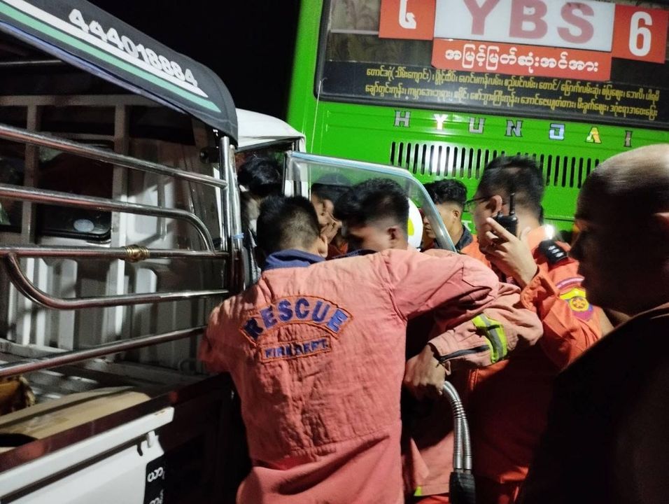 ရန်ကုန်တိုင်းဒေသကြီး၊ ဒဂုံမြို့သစ်(တောင်ပိုင်း)မြို့နယ်၊ ၆၆ ရပ်ကွက် ဧရာဝဏ်လမ်းမကြီးပေါ်တွင် နိုဝင်ဘာ ၂၆ ရက် ည ၇ နာရီခွဲခန့်က အမျိုးသားတစ်ဦးမောင်းနှင်လာသော Nissan အဖြူရောင်ယာဥ်မှာ YBS- ၆ ခရီးသည်တင်ယာဥ်ကို ဝင်တိုက်မိခဲ့သဖြင့် Nissan ယာဥ်မောင်းဒဏ်ရာရရှိခဲ့ကြောင်း ကယ်ဆယ်ရေး ဆောင်ရွက်ခဲ့သူများထံမှ သိရသည်။