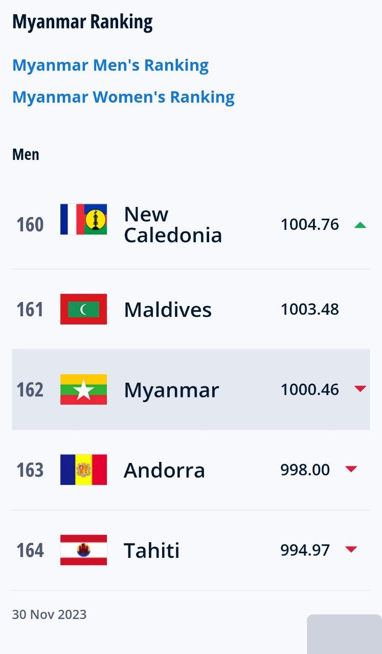 ၂၀၂၆ ကမ္ဘာ့ဖလား ဒုတိယအဆင့်ခြေစစ်ပွဲမှာ နှစ်ပွဲဆက် ဂိုးပြတ်ရှုံးပွဲကြုံတွေ့ခဲ့ရတဲ့ မြန်မာအသင်းဟာ ကမ္ဘာ့ဘောလုံးအဖွဲ့ချုပ်ကနေ နိုဝင်ဘာလအတွက် ထုတ်ပြန်ခဲ့တဲ့ ကမ္ဘာ့အဆင့်သတ်မှတ်ချက်အရ ၄ ဆင့်ကျဆင်းပြီး အဆင့် ၁၆၂ ကို ပြန်လည်ရောက်ရှိသွားပါတယ်။