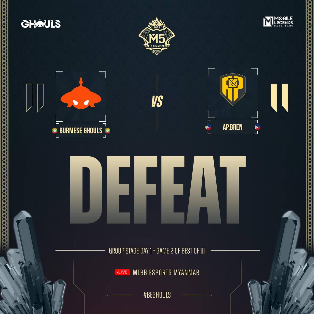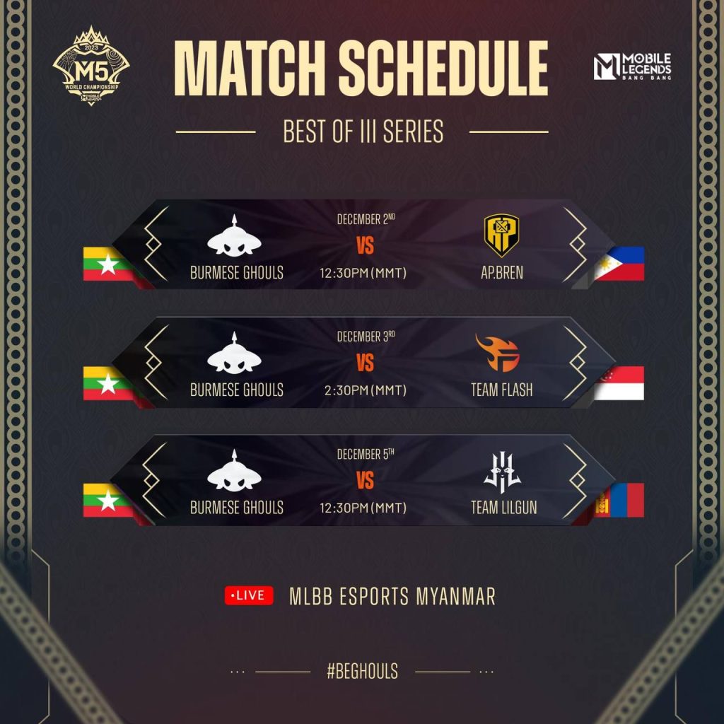 ဒီနေ့(ဒီဇင်ဘာ ၂ ရက်) က စပြီး ဖိလစ်ပိုင်နိုင်ငံ၊ မနီလာမြို့မှာ ကျင်းပနေတဲ့ Mobile Legends Bang Bang (MLBB) ရဲ့ World Championship M5 ပွဲစဉ်ကြီးရဲ့ အုပ်စုပွဲစဉ်တွေမှာ အဖွင့်ပွဲအဖြစ် မြန်မာကိုယ်စားပြုအသင်း Burmese Ghouls နဲ့ အိမ်ရှင် ဖိလစ်ပိုင်အသင်း AP Bren တို့ အကြိတ်အနယ် ယှဉ်ပြိုင်ခဲ့ရာမှာ Burmese Ghouls အသင်းက ရှုံးနိမ့်ခဲ့ပါတယ်။