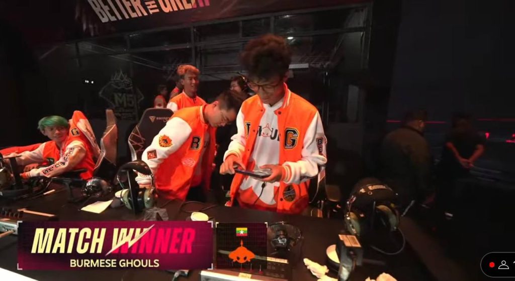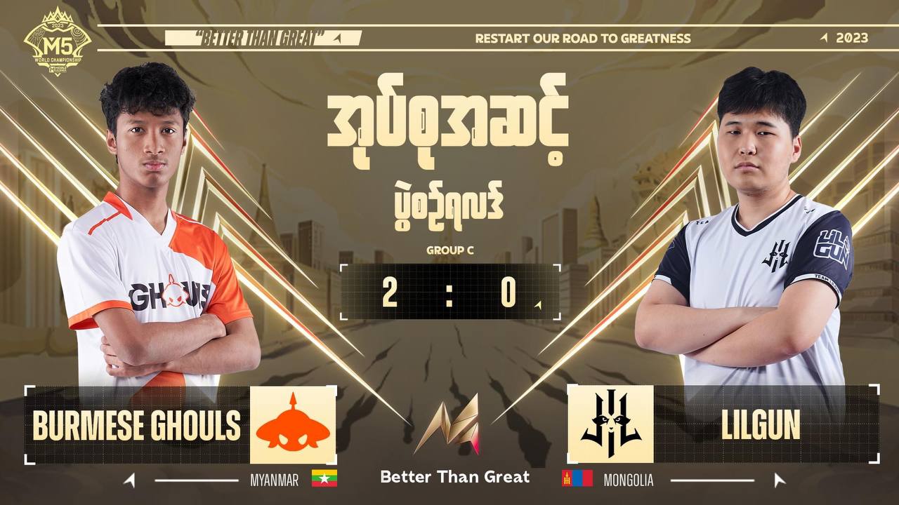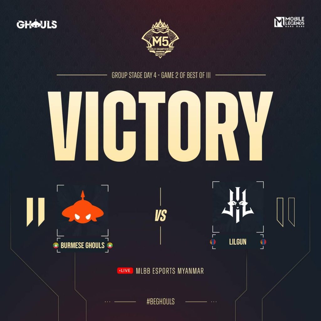 ပြီးခဲ့တဲ့ ဒီဇင်ဘာ ၂ ရက်က စပြီး ဖိလစ်ပိုင်နိုင်ငံ၊ မနီလာမြို့မှာ ကျင်းပနေတဲ့ Mobile Legends Bang Bang (MLBB) ရဲ့ World Championship M5 ပွဲစဉ်ကြီးရဲ့အုပ်စုအဆင့် စတုတ္ထနေ့ပွဲစဉ်တွေမှာ မြန်မာကိုယ်စားပြုအသင်း Burmese Ghouls က မွန်ဂိုလီးယားနိုင်ငံအသင်းဖြစ်တဲ့ Team Lilgunကို ၂ ပွဲပြတ်ရလဒ်နဲ့ အနိုင်ရရှိခဲ့ပြီး Burmese Ghouls အသင်းအနေနဲ့ အုပ်စုတက်နိုင်ဖို့ မျှော်လင့်ချက်တွေ ပိုမိုအားကောင်းလာခဲ့ပြီပဲ ဖြစ်ပါတယ်။