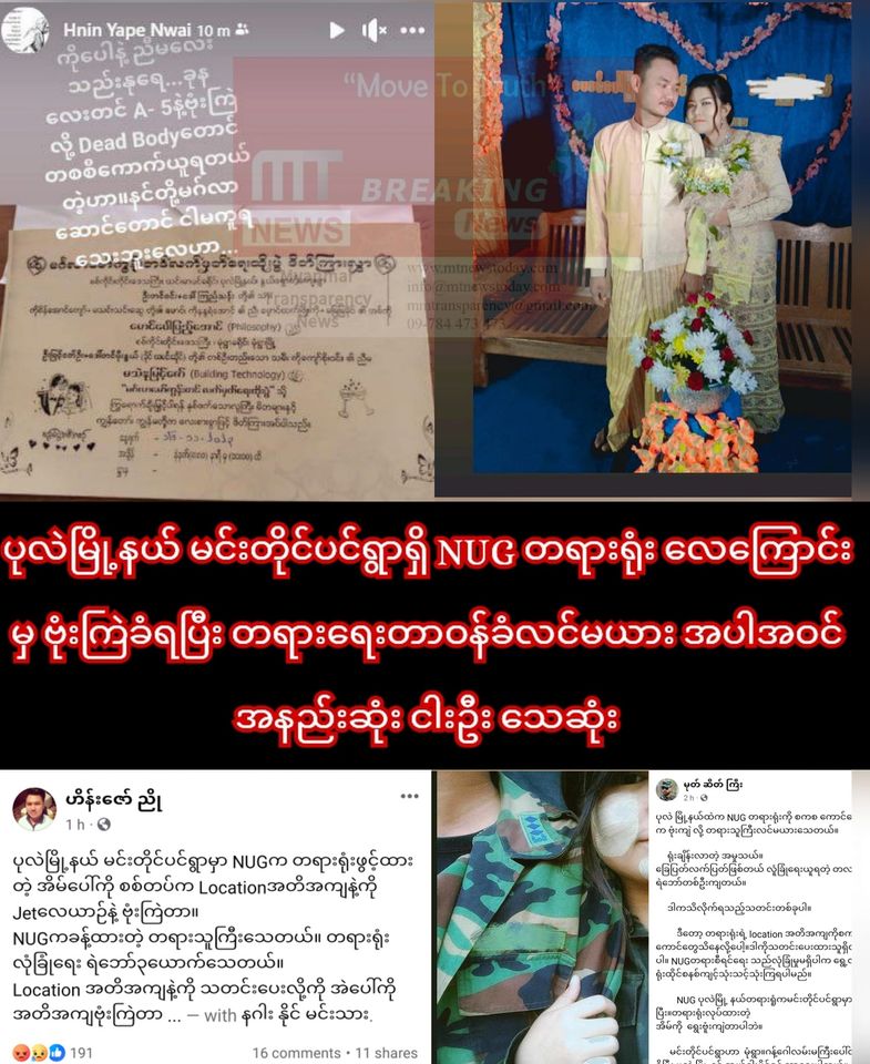 “နေဘုန်းလတ်ကပြောတော့ ကျွန်တော်တို့ NUG ဟာ တရားဝင်အစိုးရဖြစ်နေပြီတဲ့။ စိုးမိုးနယ်မြေတွေရှိနေပြီတဲ့။ ဒီနေ့ ၁၂. ၁၂. ၂၀၂၃ နေ့မှာဘဲ ပုလဲမြို့နယ်ထဲက မင်းတိုင်ပင်ရွာ(ကင်းဝန်မင်းကြီးဦးကောင်းရဲ့ဇာတိရွာ) က NUG ပြည်သူ့တရားရုံးကို လေကြောင်းကနေထုလိုက်တာ တရားရေးဝန်ထမ်း ၃ ဦးကြွသွားတယ်။ အမှုလာပြီး ရင်ဆိုင်တဲ့သူ ၃ ဦး ခြေတွေလက်တွေပြတ်ကုန်တယ်။ သူတို့ကတော့ ကျည်ကွယ်မျက်ကွယ်ကနေ ညွှန်ကြားချက်တွေပေးပြီး ပါဝါပြ ဂုဏ်ဆာနေကြတယ်။ အောက်ခြေက အမြှောက်ကြိုက်တွေ ဘာအကာအကွယ်မှမရှိဘဲ စတေးခံနေကြရတယ်။ လေးစားတယ်နုဂျီရေ” လို့ Ko Oo Swe My အကောင့်ပိုင်ရှင်က ရေးသားထားပါတယ်။