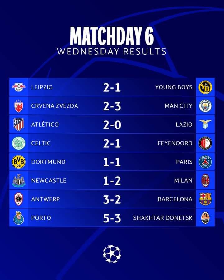 ◾ဒီနေ့ည ချန်ပီယံလိဂ် အုပ်စု နောက်ဆုံးပွဲစဉ်တွေမှာ PSG အသင်းနဲ့ ပေါ်တိုအသင်းတို့ အုပ်စုတက်ခဲ့ပြီး နယူးကာဆယ် အသင်း အုပ်စုကနေ ထွက်ခဲ့ရပါတယ်။ အင်္ဂလန် ပရီးမီးယားလိဂ် ကိုယ်စားပြု အသင်းနှစ်သင်းဖြစ်တဲ့ အာဆင်နယ်အသင်းနဲ့ မန်စီးတီးအသင်း အုပ်စုတက်ခဲ့ပေမဲ့ မန်ယူနဲ့ နယူးကာဆယ်ဟာ ချန်ပီယံလိဂ်မှာ တတိယတောင်မရဘဲ ထွက်ခဲ့ရတာကြောင့် ချန်ပီယံလိဂ်ပြိုင်ပွဲမှာ အင်္ဂလန် ပရီးမီယားလိဂ်ကိုယ်စားပြုအသင်းနှစ်သင်းသာ အုပ်စုတက်ခဲ့ပြီး မန်ယူနဲ့ နယူးကာဆယ်ကတော့ ယူရိုပါလိဂ်ကိုပါ ကျောခိုင်းခဲ့ရတာ ဖြစ်ပါတယ်။