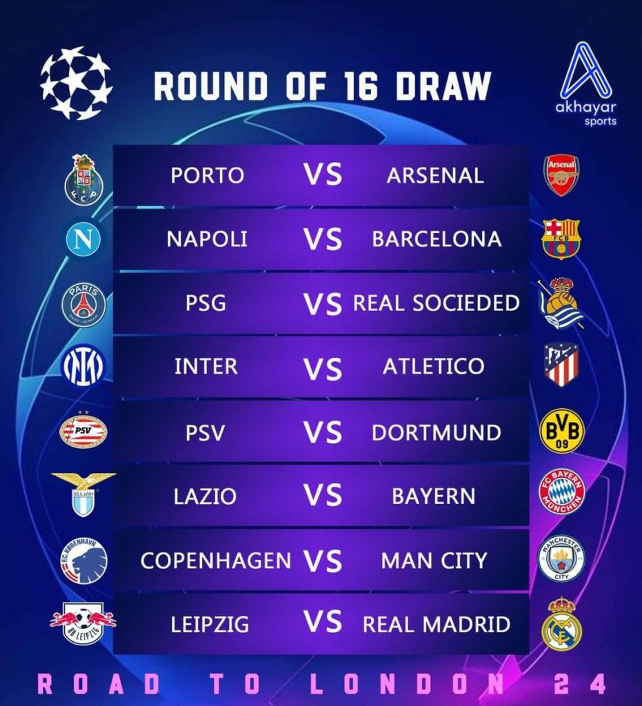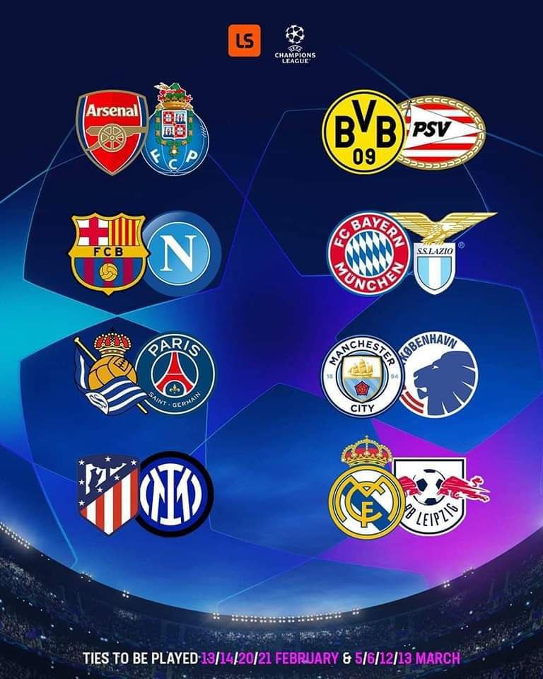 ၁၆ သင်းအဆင့် ရှုံးထွက်ပွဲစဥ်တွေမှာ ပေါ်တိုနဲ့ အာဆင်နယ်၊ နာပိုလီနဲ့ ဘာစီလိုနာ၊ ပီအက်စ်ဂျီနဲ့ ရီးရဲ ဆိုစီဒက်၊အင်တာမီလန်နဲ့ အက်သလက်တီကိုမက်ဒရစ်၊ ပီအက်စ်ဗွီနဲ့ ဒေါ့မွန်၊ လာဇီယိုနဲ့ ဘိုင်ယန်မြူးနစ်၊ လိုက်ပ်ဇစ်နဲ့ ရီးရဲမက်ဒရစ်တို့ တွေ့ဆုံနေသလို လက်ရှိချန်ပီယံမန်စီးတီးက ကိုပင်ဟေဂင်နဲ့ ပထမအကျော့ အဝေးကွင်းမှာ ရင်ဆိုင်ရမှာပါ။
