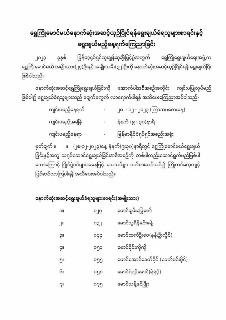 ၂၀၂၃ ခုနှစ် မြန်မာ့ရုပ်ရှင်ထူးချွန်ဆုချီးမြှင့်ပွဲအတွက် ဒုတိယအဆင့် ရွေးချယ်ခံရတဲ့ ရွှေကြိုမောင်မယ် ၉၇ ဦးကို စိစစ်အပြီးမှာ နောက်ဆုံးအဆင့် ယှဥ်ပြိုင်ရမဲ့ ရွှေကြိုမောင်မယ် ၅၆ ဦးရဲ့စာရင်းတွေကို မြန်မာနိုင်ငံ ရုပ်ရှင်အစည်းအရုံးက ဒီနေ့ ထုတ်ပြန်ကြေညာလိုက်ပါတယ်။