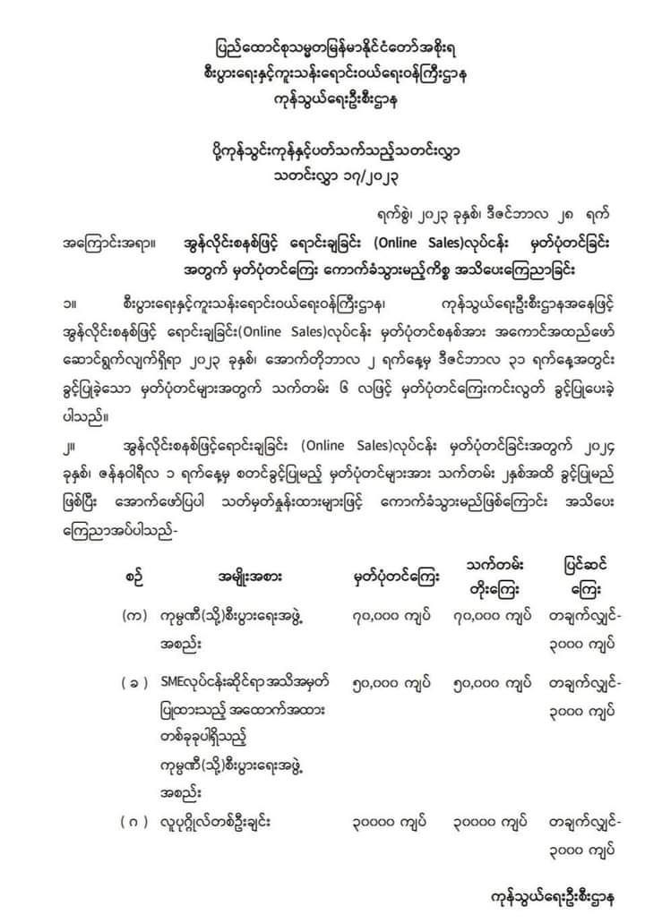 စီးပွားရေးနှင့် ကူးသန်းရောင်းဝယ်ရေးဝန်ကြီးဌာန၊ ကုန်သွယ်ရေးဦးစီးဌာနအနေဖြင့် အွန်လိုင်းစနစ်ဖြင့် ရောင်းချခြင်း (Online Sales) လုပ်ငန်း မှတ်ပုံတင်စနစ်အား အကောင်အထည်ဖော်ဆောင်ရွက်လျက်ရှိရာ ၂၀၂၃ ခုနှစ်၊ အောက်တိုဘာ ၂ ရက်မှ ဒီဇင်ဘာ ၃၁ ရက်အတွင်း ခွင့်ပြုခဲ့သော မှတ်ပုံတင်များအတွက် သက်တမ်း ၆ လဖြင့် မှတ်ပုံတင်ကြေးကင်းလွတ် ခွင့်ပြုပေးခဲ့ပြီးဖြစ်သည်။