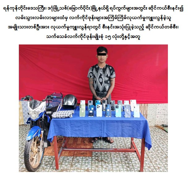 မြောက်ဒဂုံမြို့နယ်အတွင်း မော်တော်ဆိုင်ကယ်စီးနင်း၍ လမ်းသွားလမ်းလာများထံမှ လက်ကိုင်ဖုန်းများလုယက်သူအမျိုးသားတစ်ဦးအား ဖုန်းမျိုးစုံ ၁၅ လုံးနှင့်အတူ ဖမ်းမိခဲ့ကြောင်း သိရသည်။