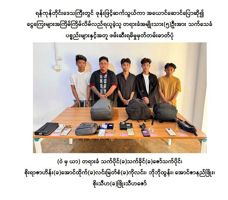 ရန်ကုန်တိုင်းဒေသကြီးတွင် ဖုန်းဖြင့်ဆက်သွယ်ကာ အယောင်ဆောင်ပြောဆို၍ ငွေကြေးများ အကြိမ်ကြိမ်လိမ်လည်ရယူခဲ့သူ တရားခံအမျိုးသား ၅ ဦးအား သက်သေခံပစ္စည်းများနှင့်အတူ ဖမ်းဆီးရမိခဲ့ကြောင်း SAC သတင်းထုတ်ပြန်ရေးအဖွဲ့မှ ယနေ့တွင် ထုတ်ပြန်ထားသည်။