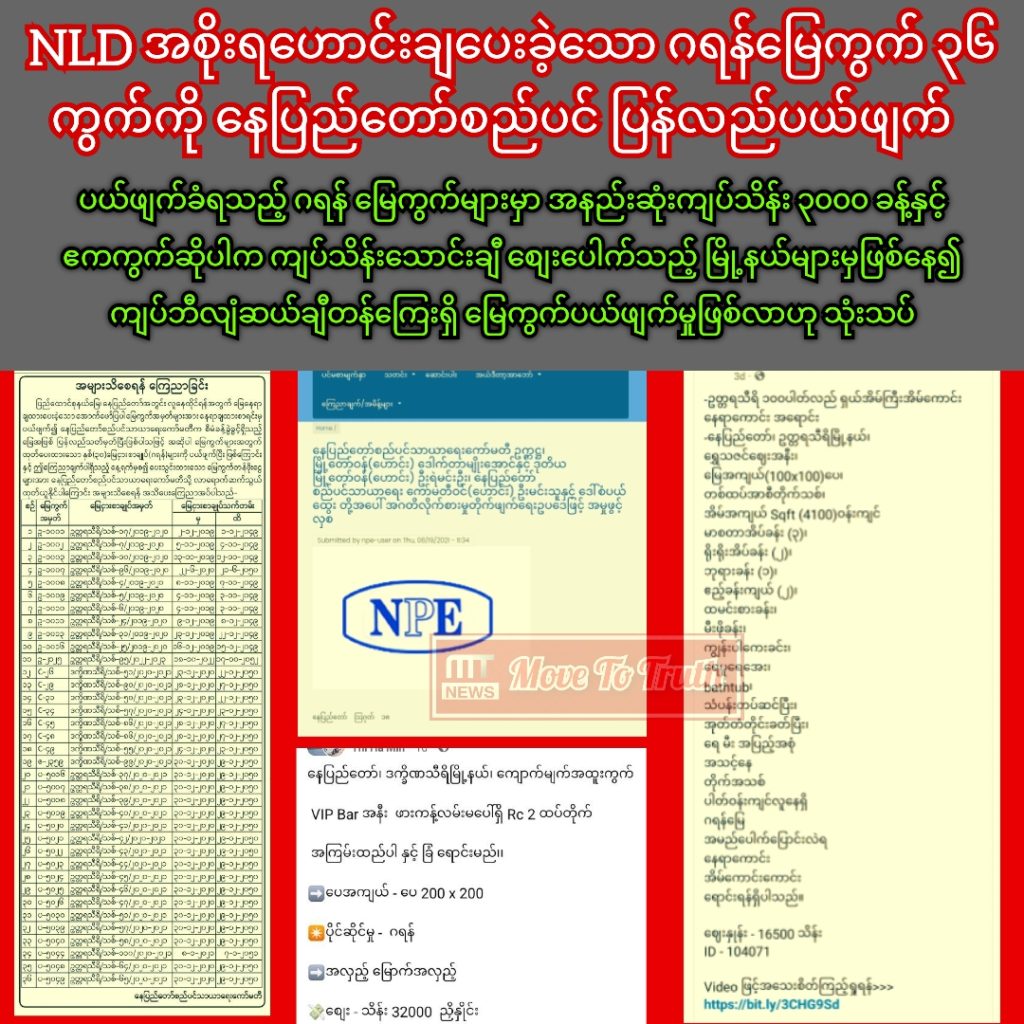 အဆိုပါမြေကွက် ၃၆ ကွက်သည်လည်း NLD ပါတီ အာဏာမရခင်က ဒေါ်အောင်ဆန်းစုကြည်ကိုယ်တိုင် မြေကွက်များ ရယူမည်မဟုတ်ဟု ပြောခဲ့သော်လည်း အာဏာရလာချိန်နှင့် အာဏာသက်တမ်းမကုန်ဆုံးမီ NLD အစိုးရ(ဟောင်း)အဖွဲ့ဝင်များ လက်ဦးမှုယူကာ ခွဲဝေချထားပေးခဲ့သည့် မြေကွက်များဖြစ်ကြောင်း သိရသည်။