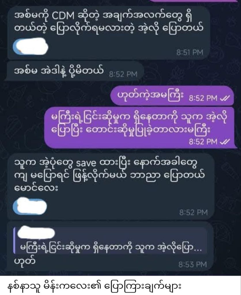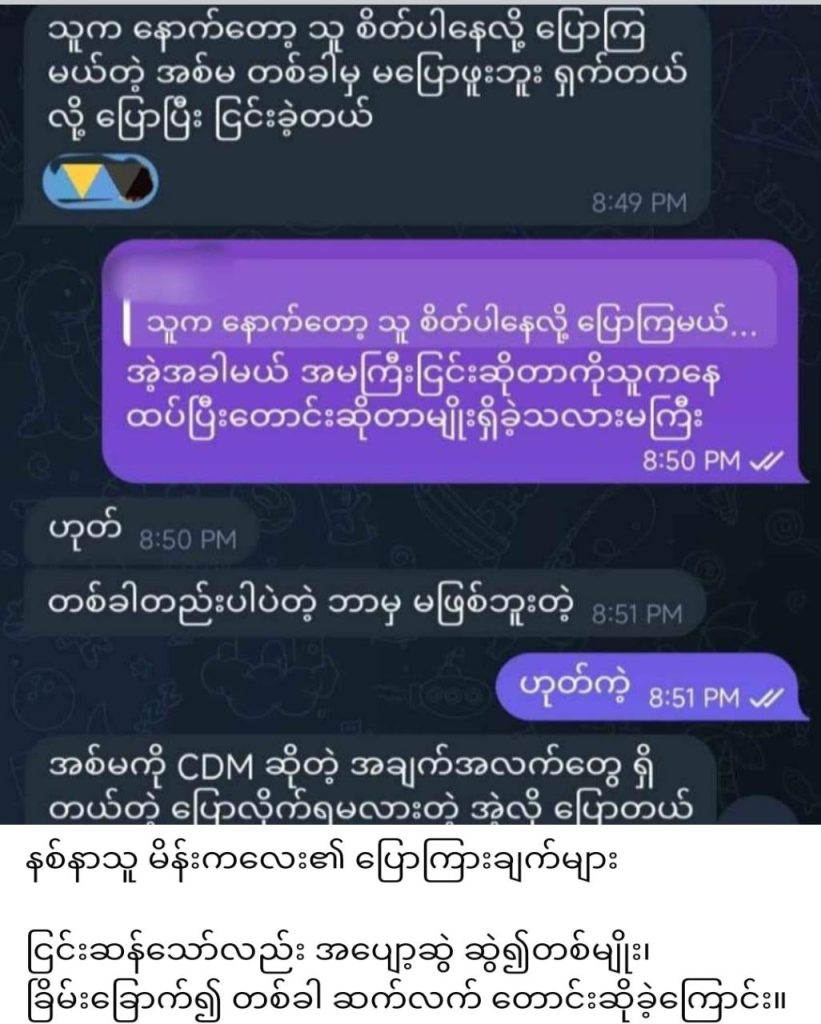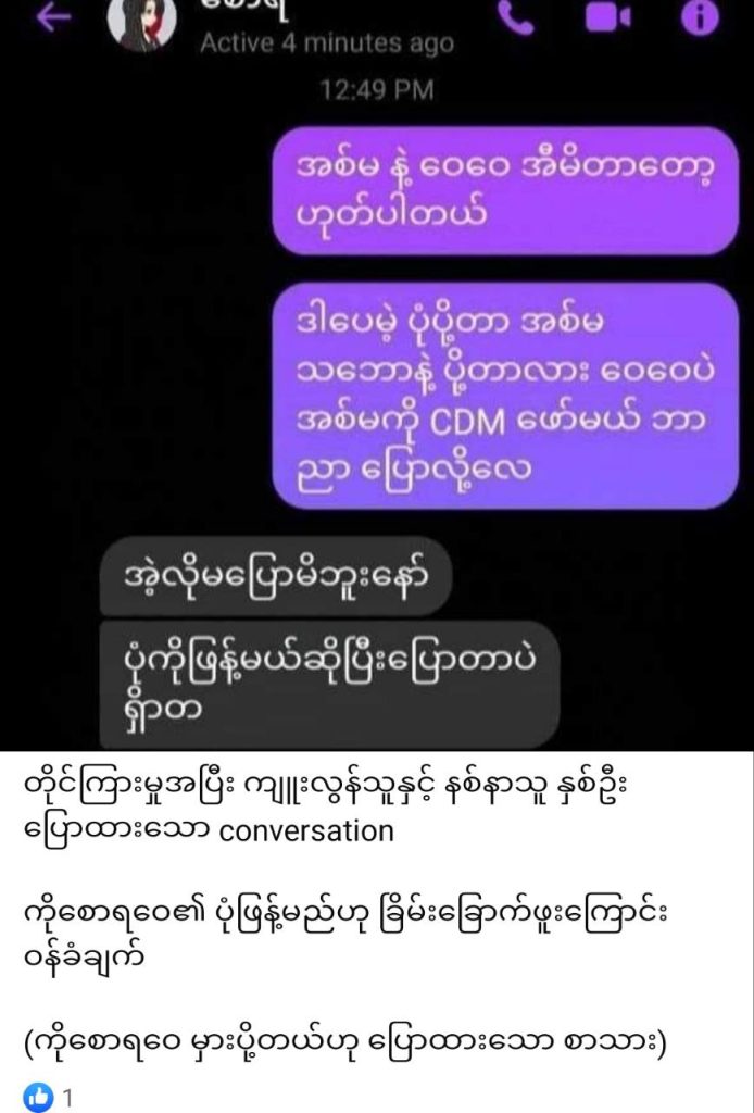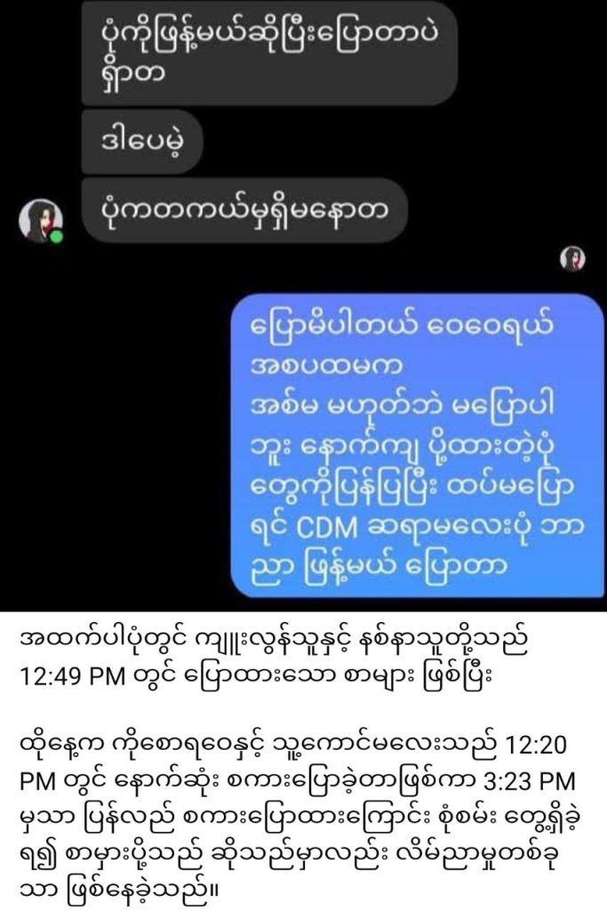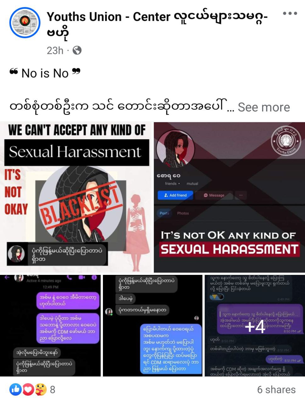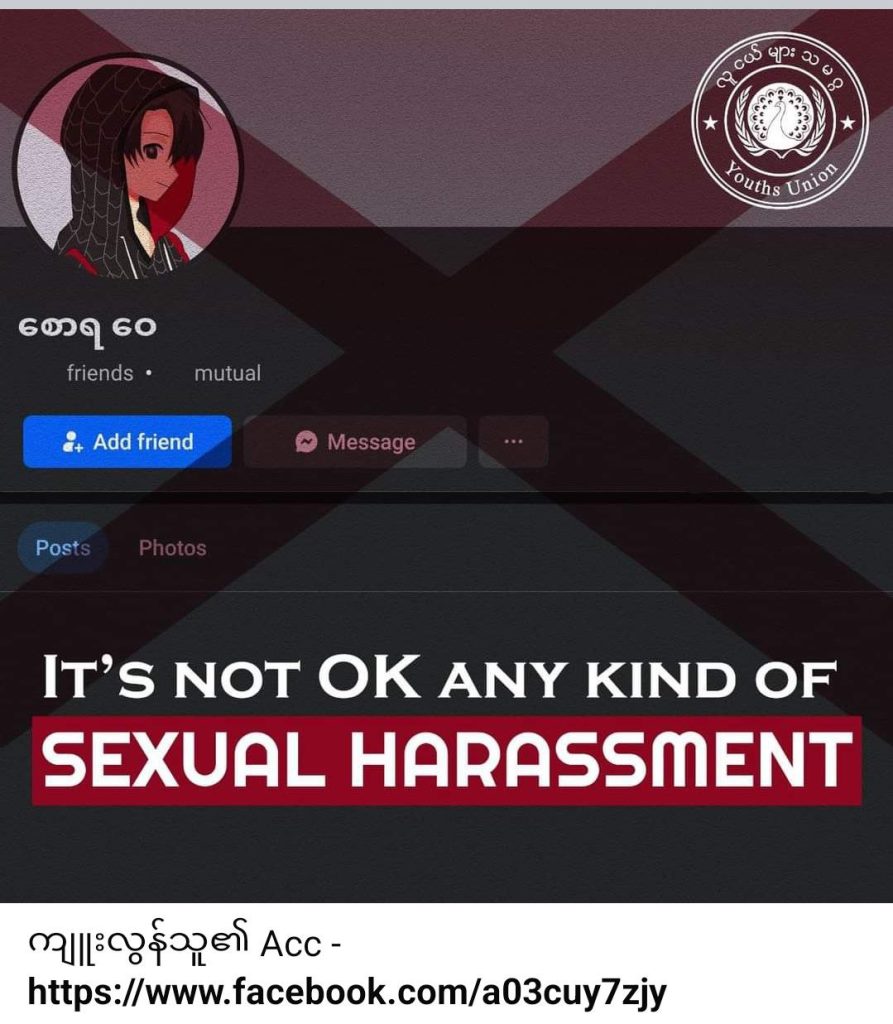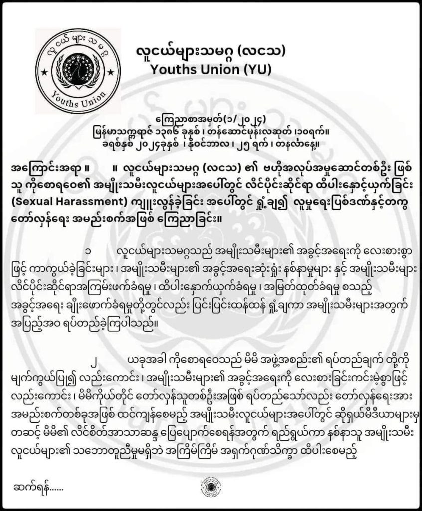 CDM အမျိုးသမီးတစ်ဦး၏ပုံကို အကြိမ်ကြိမ် ခြိမ်းခြောက်တောင်းခံပြီး လိင်စိတ်ဖြေဖျောက်သည့် လူငယ်များသမဂ္ဂ၏ ဗဟိုအလုပ်အမှူဆောင် စောရဝေ ဆိုသူကို တော်လှန်ရေးအမည်းစက်အဖြစ် သတ်မှတ်ထုတ်ပယ်လိုက်သည်ဟု လူငယ်များသမဂ္ဂ (Youths Union) က သတင်းထုတ်ပြန်ထားသည်။