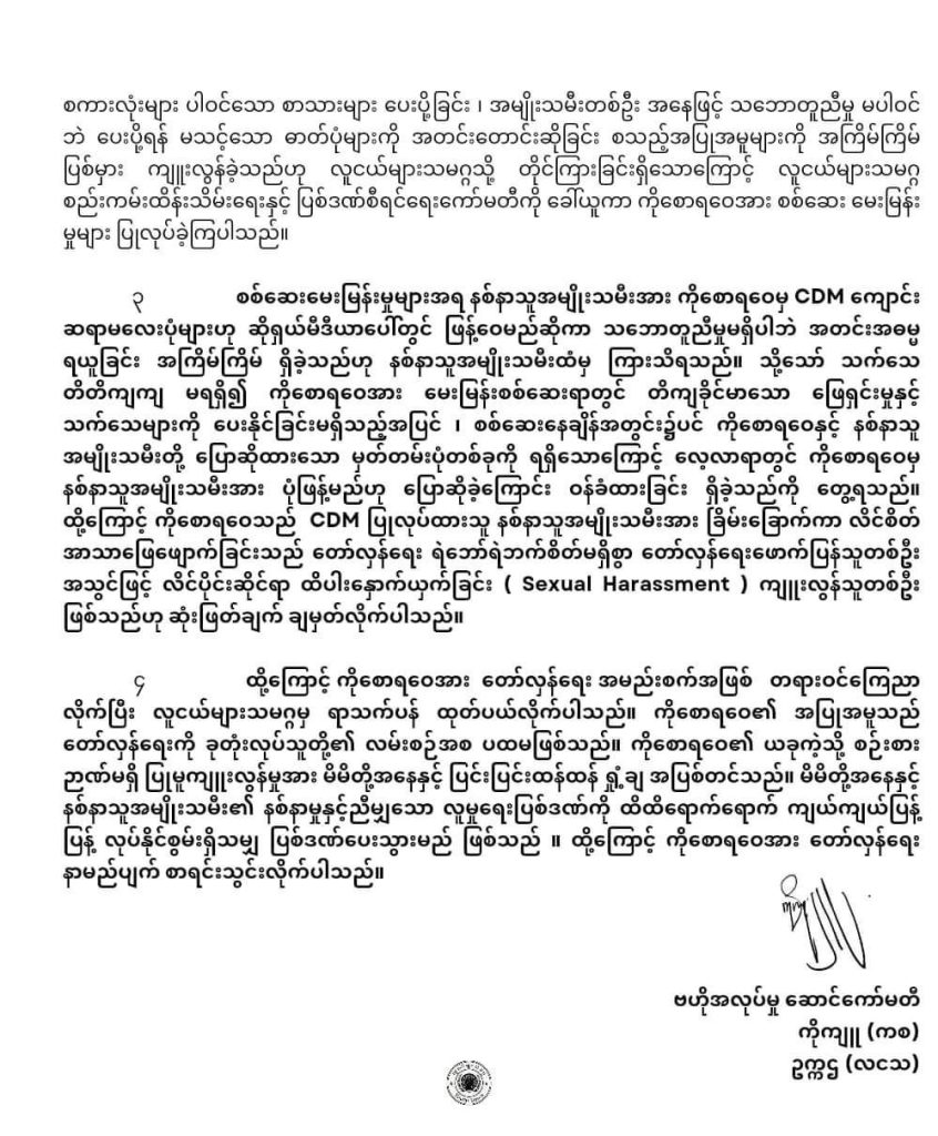 စစ်ဆေးမေးမြန်းမှုများအရ နစ်နာသူအမျိုးသမီးအား စောရဝေမှ CDM ကျောင်းဆရာမလေးပုံများဟု ဆိုရှယ်မီဒီယာပေါ်တွင် ဖြန့်ဝေမည်ဆိုကာ သဘောတူညီမှုမရှိပါဘဲ အတင်းအဓမ္မရယူခြင်း အကြိမ်ကြိမ်ရှိခဲ့သည်ဟု နစ်နာသူအမျိုးသမီးထံမှ ကြားသိရသည်။ သို့သော် သက်သေတိတိကျကျ မရရှိ၍ ကိုစောရဝေအား မေးမြန်းစစ်ဆေးရာတွင် တိကျခိုင်မာသော ဖြေရှင်းမှုနှင့် သက်သေများကို ပေးနိုင်ခြင်းမရှိသည့်အပြင်၊ စစ်ဆေးနေချိန်အတွင်း၌ပင် စောရဝေနှင့် နစ်နာသူ အမျိုးသမီးတို့ ပြောဆိုထားသော မှတ်တမ်းပုံတစ်ခုကို ရရှိသောကြောင့် လေ့လာရာတွင် ကိုစောရဝေမှ နစ်နာသူအမျိုးသမီးအား ပုံဖြန့်မည်ဟု ပြောဆိုခဲ့ကြောင်း ဝန်ခံထားခြင်း ရှိခဲ့သည်ကို တွေ့ရသည်။ ထို့ကြောင့် စောရဝေသည် CDM ပြုလုပ်ထားသူ နစ်နာသူအမျိုးသမီးအား ခြိမ်းခြောက်ကာ လိင်စိတ်အာသာဖြေဖျောက်ခြင်းသည် တော်လှန်ရေး ရဲဘော်ရဲဘက်စိတ်မရှိစွာ တော်လှန်ရေးဖောက်ပြန်သူတစ်ဦးအသွင်ဖြင့် လိင်ပိုင်းဆိုင်ရာ ထိပါးနှောက်ယှက်ခြင်း ( Sexual Harassment ) ကျူးလွန်သူတစ်ဦး ဖြစ်သည်ဟု ဆုံးဖြတ်ချက် ချမှတ်လိုက်သည်။