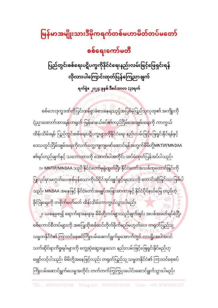 TNLA ထုတ်ပြန်ခဲ့သလိုမျိုးပဲ ခုခံစစ်ကို ကိုင်စွဲပြီး ပြည်တွင်းစစ်ရေးပဋိပက္ခအပေါ် နိုင်ငံရေးနည်းလမ်းနဲ့ ဖြေရှင်းဖို့ လိုလားတယ်လို့ တရုတ်ကိုးကန့် MNDAA က ဒီနေ့မှာ ထုတ်ပြန်လာပြန်ပါတယ်။