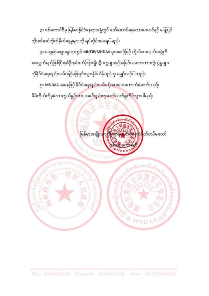 တရုတ်နိုင်ငံကြောင့် လားရှိုးကို ထိုးစစ်ဆင်မှုတွေ ရပ်ဆိုင်းမယ်လို့ လိမ်လည်ကြေညာချက်ထုတ်ပြီး လားရှိုးမြို့နဲ့ ရမခကို အပြင်းအထန် တိုက်ခိုက်သိမ်းယူခဲ့တဲ့ တရုတ်ကိုးကန့်လက်နက်ကိုင် MNDAA ရဲ့ ဒီနေ့ကြေညာချက်မှာလည်း စစ်ဘေးဒုက္ခဒဏ်ကို ပြင်းထန်စွာခံစားနေရတဲ့ အပြစ်မဲ့ပြည်သူလူထု အကျိုးကို ငဲ့ညှာထောက်ထားလိုတယ်ဆိုတာ၊ တရုတ်-မြန်မာနယ်စပ် တည်ငြိမ်အေးချမ်းရေးကို ကာကွယ် ထိန်းသိမ်းလိုတာ၊ ပြည်တွင်းစစ်ရေးပဋိပက္ခတွေကို နိုင်ငံရေး နည်းလမ်းနဲ့ဖြေရှင်းနိုင်ဖို့နဲ့ ဒေသတွင်းငြိမ်းချမ်းရေးကို လက်တွေ့ကျကျဖော်ဆောင်ဖို့အတွက် MNTJP/MNDAA က နိုင်ငံတော်ခွဲထွက်ပြီး နိုင်ငံတော်အသစ်ထူထောင်ခြင်းကို ပြုလုပ်မှာမဟုတ်ကြောင်း၊ စစ်မှန်တဲ့ကိုယ်ပိုင်အုပ်ချုပ်ခွင့်ရဒေသကို တောင်းဆိုခြင်းသာဖြစ်ကြောင်း၊ MNDAA အနေနဲ့ နိုင်ငံတော်အချုပ် အခြာအာဏာနဲ့ နိုင်ငံပိုင်နယ်မြေ တည်တံ့ ခိုင်မြဲရေးကို တစ်စိုက်မတ်မတ် ထိန်းသိမ်းကာကွယ်သွားမယ့်အကြောင်း၊ MNDAA တပ်တွေက ဒီနေ့ကစ ချက်ချင်း အပစ်အခတ်ရပ်စဲပြီး အစပြုထိုးစစ်ဆင်တိုက်ခိုက်မှာမဟုတ်ကြောင်း ဖော်ပြထားပါတယ်။