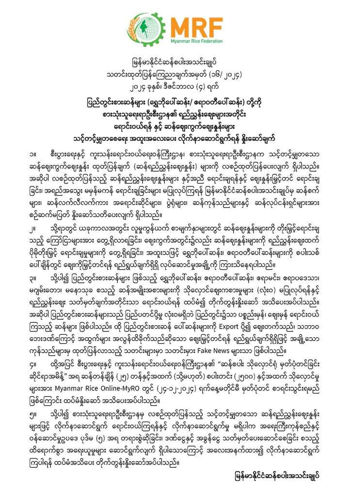 လက်ရှိတွင် ဈေးကွက်အတွင်း ပြည်တွင်းစားဆန် ပေါ်ဆန်းများကို ပြည်ပတင်ပို့၍ ဈေးတက်သည်၊ သဘာဝဘေးဒဏ်ကြောင့် အထွက်နှုန်းအလွန်ထိခိုက်သည်ဆိုသော ဈေးမြှင့်တင်ရန် ရည်ရွယ်ချက်ရှိရှိဖြင့် အချို့သောကုန်သည်များမှ ထုတ်ပြန်လာသည့် သတင်းများမှာ သတင်းမှား (Fake News) များသာ ဖြစ်ကြောင်း MRF က အသိပေး ထုတ်ပြန်ထားသည်။