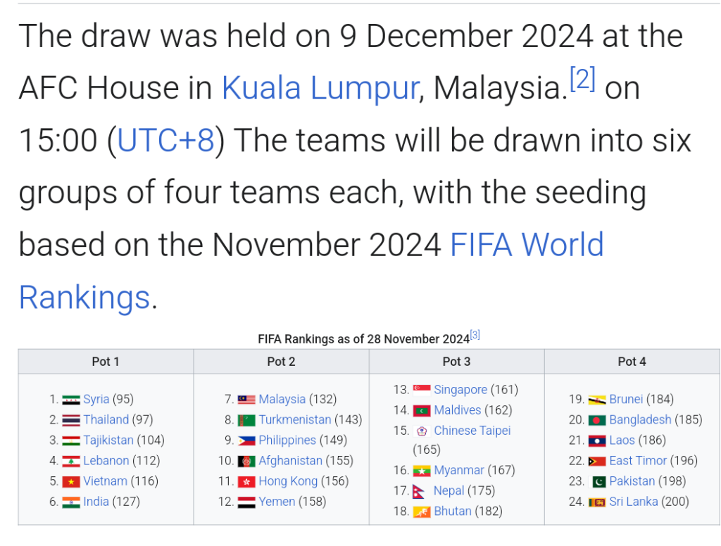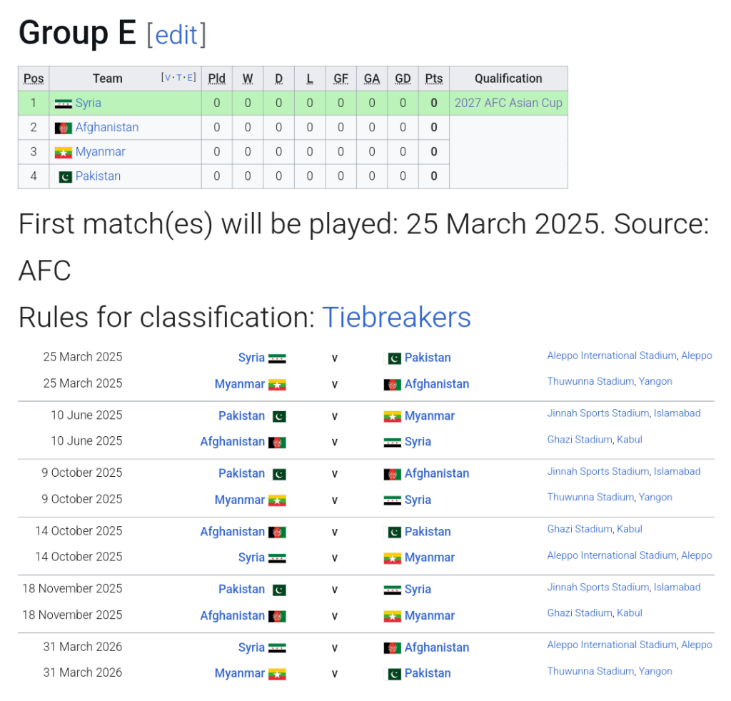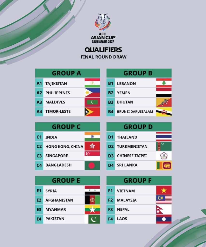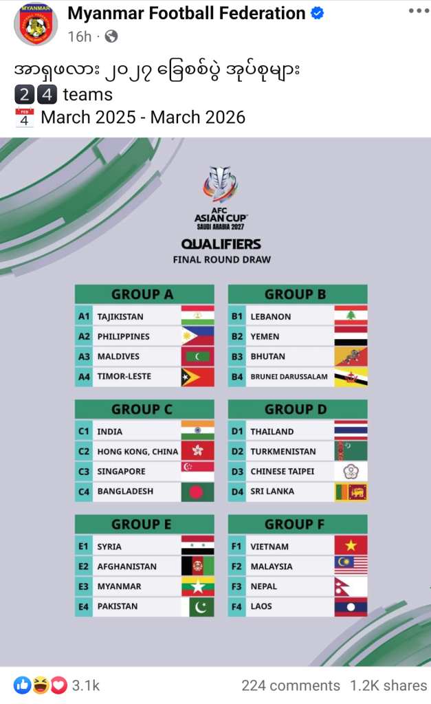 ဆော်ဒီအာရေးဗီးယားနိုင်ငံတွင် ၂၀၂၇ ခုနှစ် ဇန်နဝါရီ ၁၅ ရက်မှ ဖေဖော်ဝါရီ ၈ ရက်အထိ ကျင်းပမည့် ၂၀၂၇ အာရှဖလား ခြေစစ်ပွဲတွင် မြန်မာနိုင်ငံအပါအဝင် စစ်ဖြစ်ပွားနေပြီး ပြည်တွင်းရေးမတည်ငြိမ်သောနိုင်ငံလေးခုက Group – E ၌ သီးသန့်ဆုံတွေ့နေကြောင်း သိရသည်။