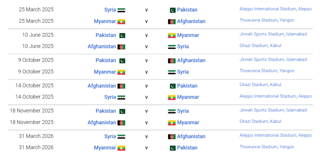 မြန်မာနိုင်ငံအပါအဝင် မငြိမ်းချမ်းသော နိုင်ငံလေးခု သီးသန့်ဆုံတွေ့ပေးထားသည့် အဆိုပါ ၂၀၂၇ အာရှဖလား ခြေစစ်ပွဲများကို မြန်မာနိုင်ငံက အိမ်ကွင်းသုံးပွဲယှဥ်ပြိုင်ရမည်ဖြစ်ပြီး ၂၀၂၅ ခုနှစ် မတ်လ ၂၅ ရက်တွင် အာဖဂန်နစ္စတန်၊ ၂၀၂၅ ခုနှစ် အောက်တိုဘာ ၉ ရက်တွင် ဆီးရီးယားနှင့် ၂၀၂၆ ခုနှစ် မတ်လ ၃၁ ရက်တို့တွင် ပါကစ္စတန်တို့ကို သုဝဏ္ဏကွင်း၌ ယှဥ်ပြိုင်ကစားရမည်ဖြစ်သည်။
