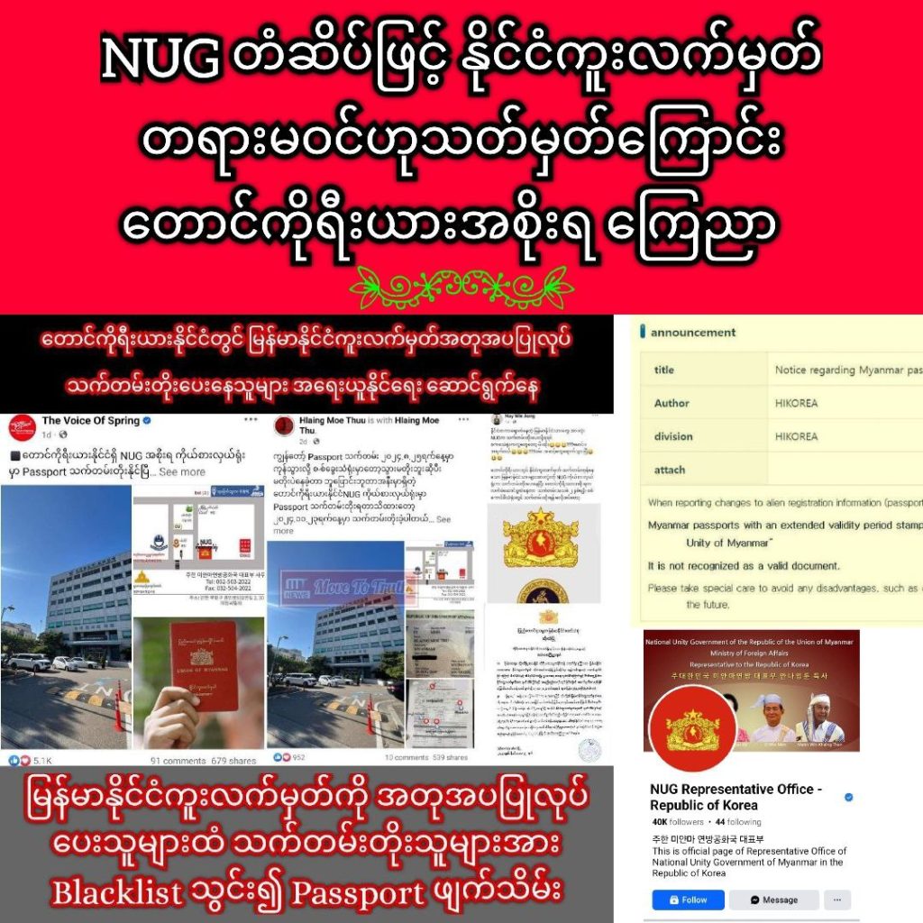 နိုဝင်ဘာလဆန်းအတွင်းမှာ နစကအစိုးရလုပ်ဆောင်ပေးထားတဲ့ နိုင်ငံကူးလက်မှတ်တွေကို တောင်ကိုရီးယားနိုင်ငံရောက် NUG ကိုယ်စားလှယ်ရုံးက သက်တမ်းတိုးပေးနေပြီလို့ The Voice of Spring၊ Hlaing Moe Thu၊ Nay Win Aung စတဲ့ Page တွေ အကောင့်တွေက သက်တမ်းတိုးပေးထားတဲ့ ပုံတွေနဲ့တကွ ဖော်ပြခဲ့တာဖြစ်ပြီး NUG ရုံးက ဒီလိုသက်တမ်းတိုးပေးနေမှုဟာ တရားမဝင်သလို နိုင်ငံကူးလက်မှတ် ကိုင်ဆောင်အသုံးပြုခြင်းဆိုင်ရာ စည်းကမ်းတွေကို ဖောက်ဖျက်မိတာကြောင့် မိခင်နိုင်ငံနဲ့ အိမ်ရှင်နိုင်ငံတို့က ဥပဒေအရ အရေးယူခံရနိုင်ကြောင်းနဲ့ စိစစ်တွေ့ရှိပါက နိုင်ငံကူးလက်မှတ် ဖျက် သိမ်းခြင်းနဲ့ အမည်မည်းစာရင်းသွင်းခြင်းတို့ကို ဆောင်ရွက်ခံရမှာဖြစ်ကြောင်း အသိပေးနှိုးဆော်ချက်ကို အောက်တိုဘာ ၁၅ ရက်မှာ ကိုရီးယားနိုင်ငံဆိုင်ရာ မြန်မာသံရုံးကလည်း အသိပေးထားပါတယ်။ ဒီလိုအသိပေးထားတဲ့ကြားက တချို့သော မြန်မာနိုင်ငံသားတွေဟာ မြန်မာနိုင်ငံကူးလက်မှတ်တွေကို တရားမဝင် တံဆိပ်တုံး အတုအပနဲ့ သက်တမ်းတိုးမှု လုပ်ဆောင်နေတာ စိစစ်တွေ့ရှိရတဲ့အတွက် မြန်မာသံရုံး၊ ဆိုးလ်မြို့အနေနဲ့ ဒီနိုင်ငံကူးလက်မှတ်(Passport) တွေကို ဖျက်သိမ်းတာနဲ့ အမည်မည်းစာရင်း(Blacklist) ရေးသွင်းတာတွေကို ဆောင်ရွက်ခဲ့တယ်လို့ သိရပါတယ်။ ဒါ့အပြင် တရားမဝင် တံဆိပ်တုံး အတုအပပြုလုပ်ပြီး နိုင်ငံကူးလက်မှတ်တွေ သက်တမ်းတိုးပေးနေသူတွေကို အိမ်ရှင်နိုင်ငံ (တောင်ကိုရီးယား) တရားဥပဒေအရ ထိရောက်စွာ အရေးယူဟန့်တားနိုင်ဖို့ သက်ဆိုင်ရာဝန်ကြီးဌာနအဆင့် နဲ့နယ်မြေခံအဆင့် အဖွဲ့အစည်းတွေနဲ့ ညှိနှိုင်းဆောင်ရွက်နေတယ်လို့လည်း တောင်ကိုရီးယားနိုင်ငံဆိုင်ရာ မြန်မာသံရုံးက အသိပေးထုတ်ပြန်ထားတာကို ဒီဇင်ဘာ ၁၈ ရက်မှာ တောင်ကိုရီးယားအစိုးရက တရားဝင်အကောင်အထည်ဖော်ပေးခဲ့တာဖြစ်ပါတယ်။