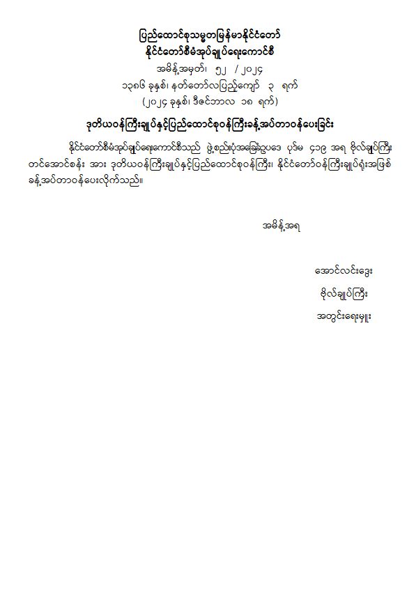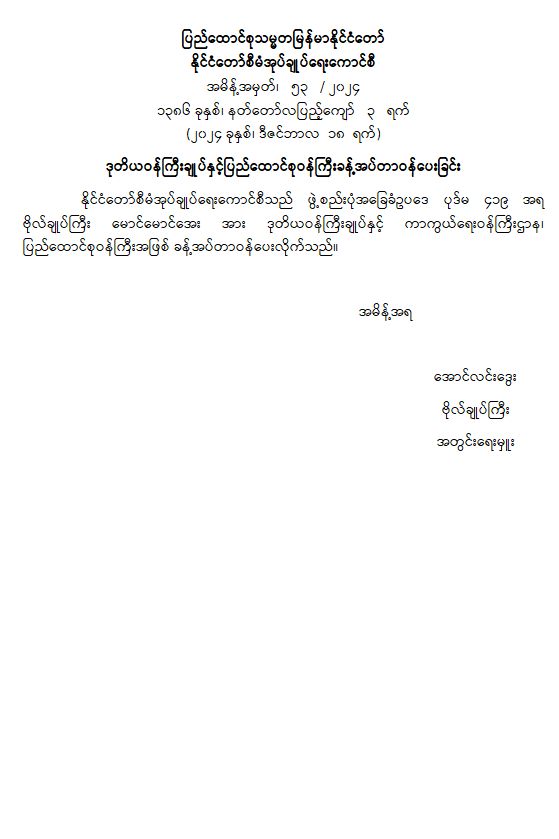 နိုင်ငံတော်စီမံအုပ်ချုပ်ရေးကောင်စီက တပ်မတော်(ကြည်း၊ ရေ၊ လေ) ညှိနှိုင်းကွပ်ကဲရေးမှူး ဗိုလ်ချုပ်ကြီးမောင်မောင်အေးကို ကာကွယ်ရေးဝန်ကြီးဌာန ပြည်ထောင်စုဝန်ကြီးနှင့် ဒုတိယဝန်ကြီးချုပ်အဖြစ် ပြောင်းလဲခန့်အပ်လိုက်သလို လက်ရှိကာကွယ်ရေးဝန်ကြီး ဗိုလ်ချုပ်ကြီးတင်အောင်စန်းကိုလည်း ဝန်ကြီးချုပ်ရုံးဝန်ကြီးနှင့် ဒုတိယဝန်ကြီးချုပ်အဖြစ် ပြောင်းလဲခန့်အပ်လိုက်ကြောင်း ယခုည ကြေညာသည်။