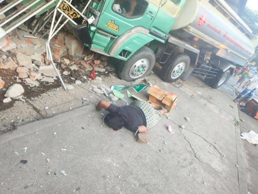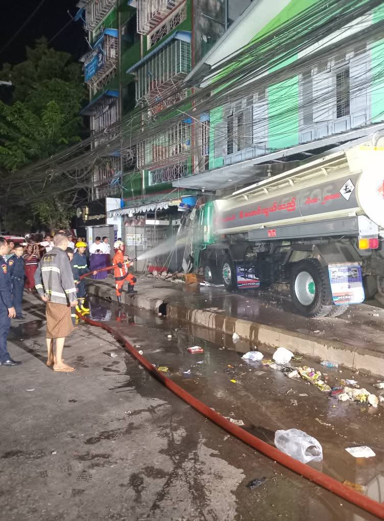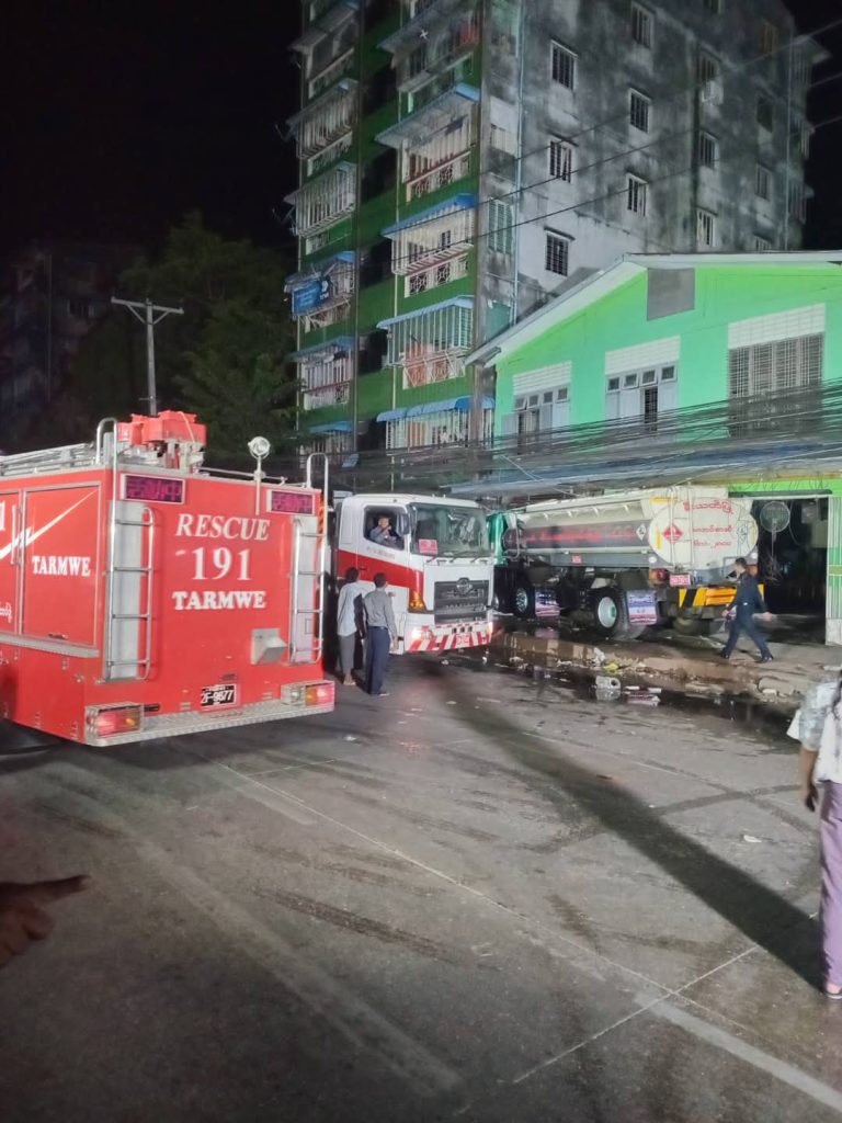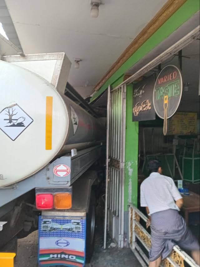 ဆီအပြည့်သယ်လာသော ဒီဇယ် ဂါလံ ၂၈၀၀ ဆံ့ ဆီဘောက်ဆာယာဉ်မှာ ကြက်ဘဲဈေးဘက်မှ တာမွေဗလီဘက်သို့ မောင်းနှင်လာစဉ် ရသာစုံလက်ဖက်ရည်ဆိုင် မျက်နှာစာရှိ ကျောက်ထုပ်ကို ဝင်တိုက်ခဲ့ခြင်း ဖြစ်ပြီးနောက် ၂ ခန်းတွဲ၊ ၈ ထပ်တိုက်၏ ဘယ်ဘက်နံရံကို ထပ်မံဝင်တိုက်ခဲ့ကြောင်း သိရသည်။