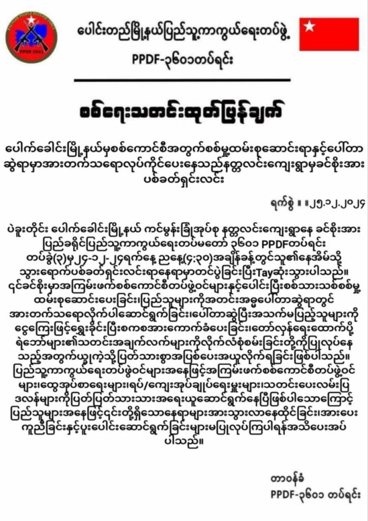 ပေါက်ခေါင်းမြို့နယ်အတွင်း စစ်မှုထမ်းစုဆောင်းရာနှင့် ပေါ်တာဆွဲရာတွင် အားတက်သရောလုပ်ကိုင်ပေးနေသည်ဟု စွပ်စွဲကာ နတ္တလင်းကျေးရွာမှ အမျိုးသားတစ်ဦးအား NUG လက်အောက်ခံ ပေါင်းတည် PDF က သတ်ဖြတ်လိုက်သည်ဟု ယနေ့ ခရစ္စမတ်နေ့တွင် ဝန်ခံချက်ထုတ်ပြန်လာသည်။