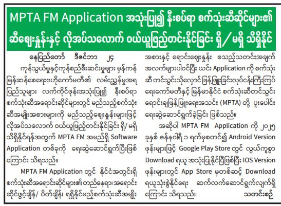 ကုန်သွယ်မှုနှင့် ကုန်စည်စီးဆင်းမှုများ မှန်ကန်မြန်ဆန်စေရေးဗဟိုကော်မတီ၏ လမ်းညွှန်မှုအရ ပြည်သူများ လက်ကိုင်ဖုန်းအသုံးပြု၍ နီးစပ်ရာစက်သုံးဆီအရောင်းဆိုင်များတွင် မည်သည့်စက်သုံးဆီအမျိုးအစားများကို မည်သည့်ဈေးနှုန်းများဖြင့် လိုအပ်သလောက် ဝယ်ယူဖြည့်တင်းနိုင်ခြင်း ရှိ/ မရှိ သိရှိနိုင်ရန်အတွက် MPTA FM အမည်ရှိ Software Application တစ်ခုကို ရေးဆွဲဆောင်ရွက်ပြီးဖြစ်ကြောင်း သိရသည်။