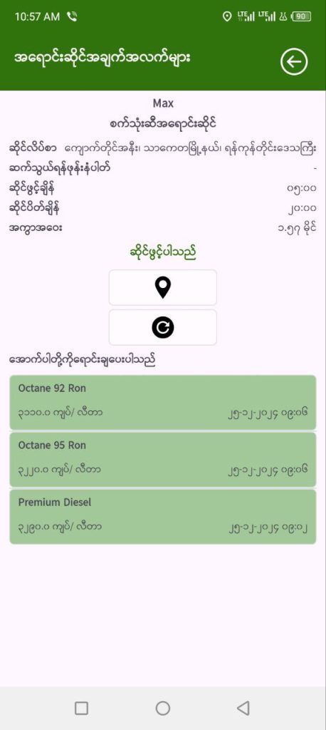 အဆိုပါ MPTA FM Application အား လက်ရှိ Download ရယူကာ ဝင်ရောက်အသုံးပြုရာတွင် အကွာအဝေး ၃ မိုင်အတွင်းထားပြီး မိမိဆီဝယ်လိုသည့် ဆီဆိုင်အမည်ကို ရိုက်ထည့်ကာ ရှာဖွေရာတွင် အဆင်ပြေမှုရှိပြီး ယနေ့ ရရှိမည့်ဆီအမျိုးအစားနှင့် ဆီဈေးနှုန်းများကို ဖော်ပြပေးထားသည်ကို တွေ့ရှိရသည်။