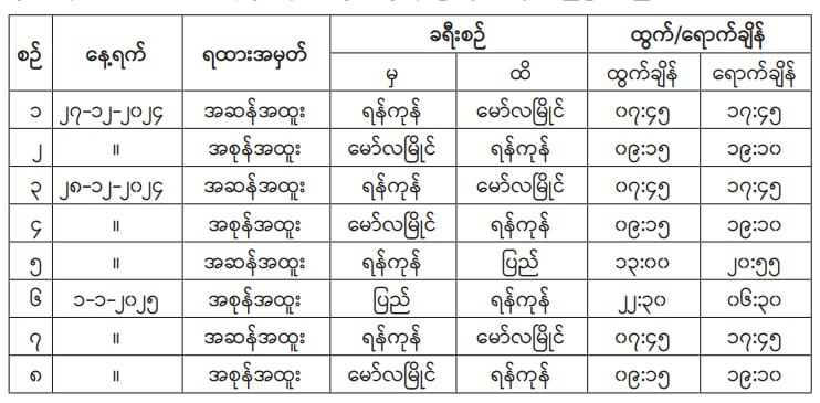 ထို့အပြင် ခရီးသွားပြည်သူများ လိုက်ပါစီးနင်းမှုအပေါ်မူတည်၍ ရန်ကုန်-မန္တလေး- ရန်ကုန်ခရီးစဉ်အတွက် ပုံမှန်ပြေးဆွဲပေးလျက်ရှိသည့် ရထားများတွင် ဝန်ချိန်ပြည့် တွဲဆိုင်းများ တိုးချဲ့ ချိတ်ဆက်ပြေးဆွဲပေးသွားမည်ဖြစ်သည်။