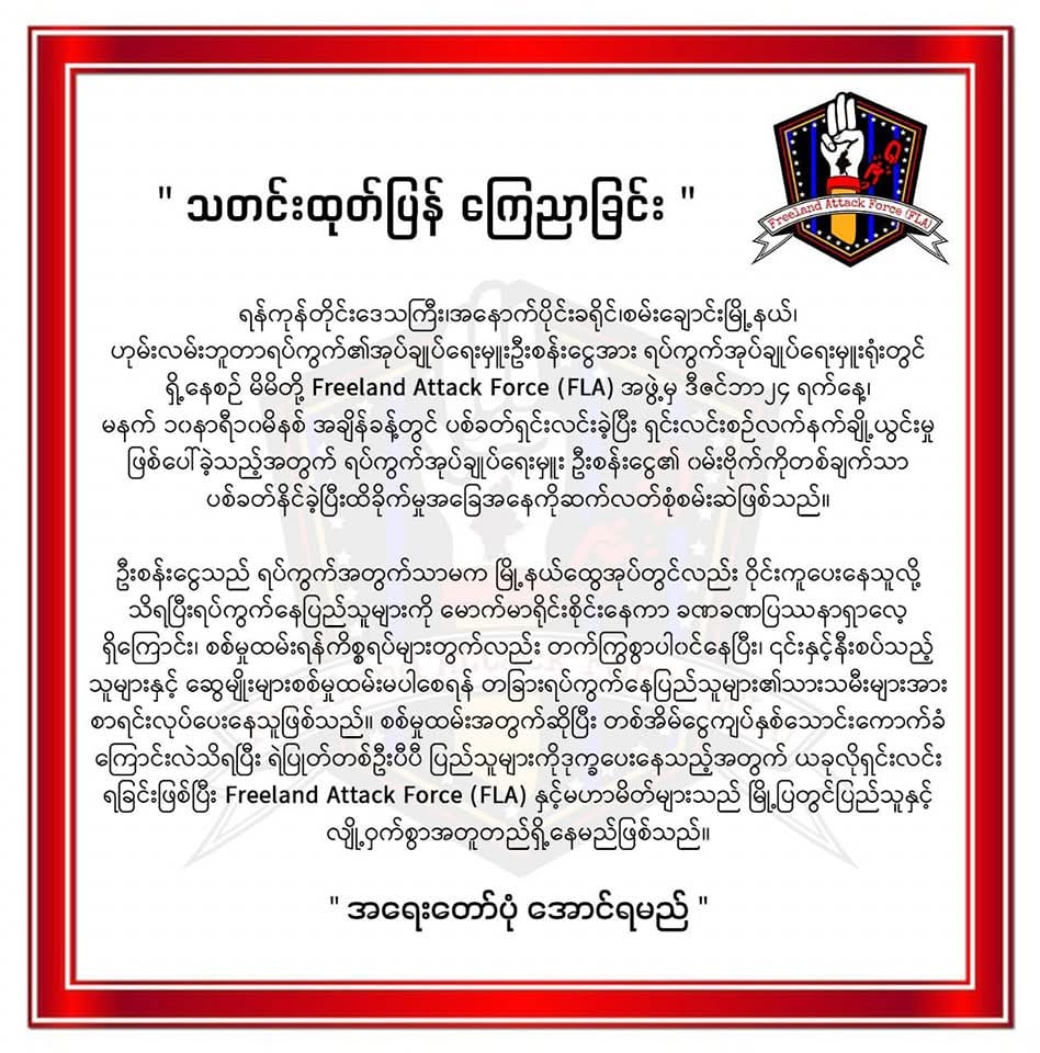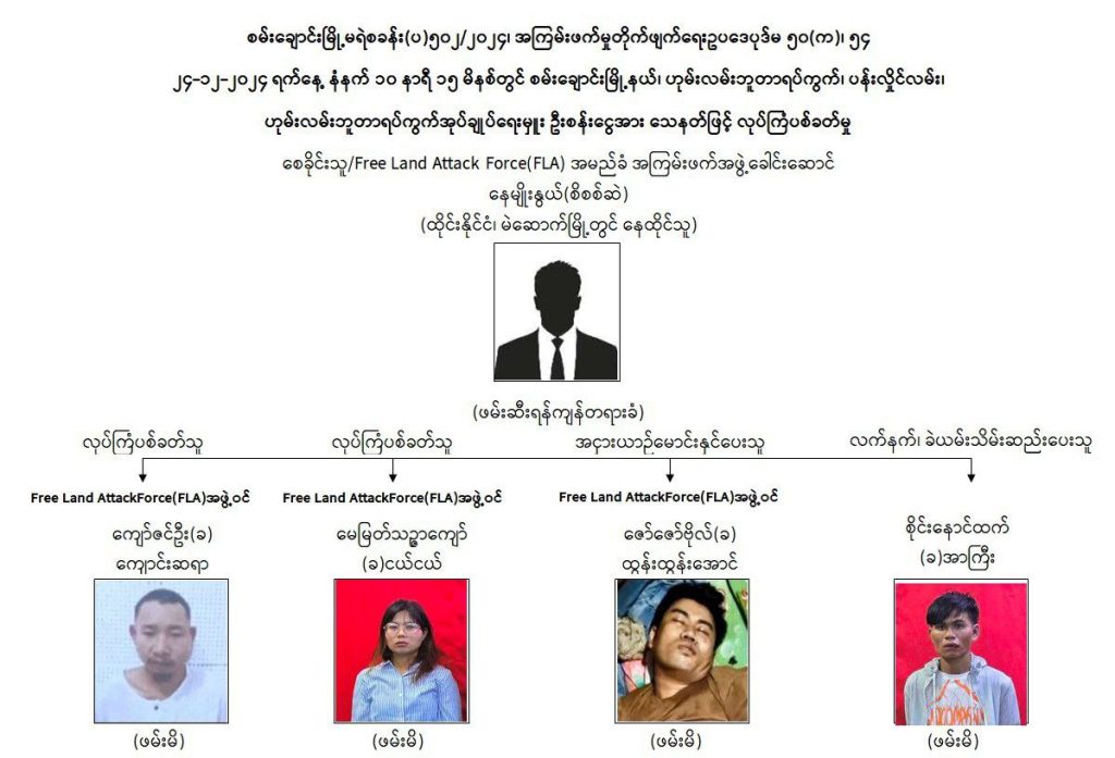 စမ်းချောင်းမြို့နယ်၊ ဟုမ်းလမ်းဘူတာရပ်ကွက်အုပ်ချုပ်ရေးမှူးအား လုပ်ကြံသတ်ဖြတ်ပြီး ရန်ကုန်တိုင်းဒေသကြီးအတွင်း မိုင်းထောင်ဖောက်ခွဲမှုများ ကျူးလွန်ထားသည့် Free Land Attack Force (FLA) အဖွဲ့ဝင်များအားလက်နက်၊ ခဲယမ်းများနှင့်အတူ ဖမ်းမိခဲ့ကြောင်း သိရသည်။