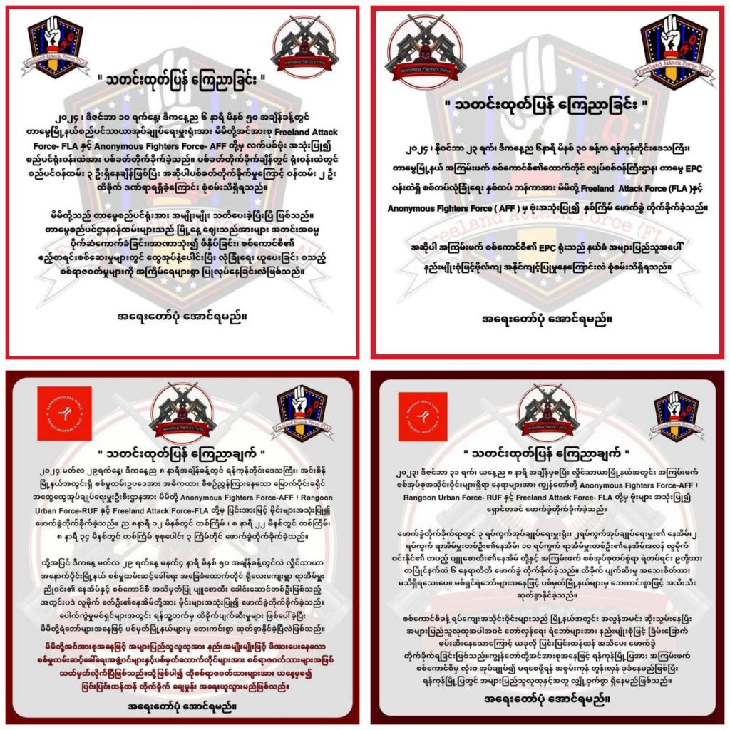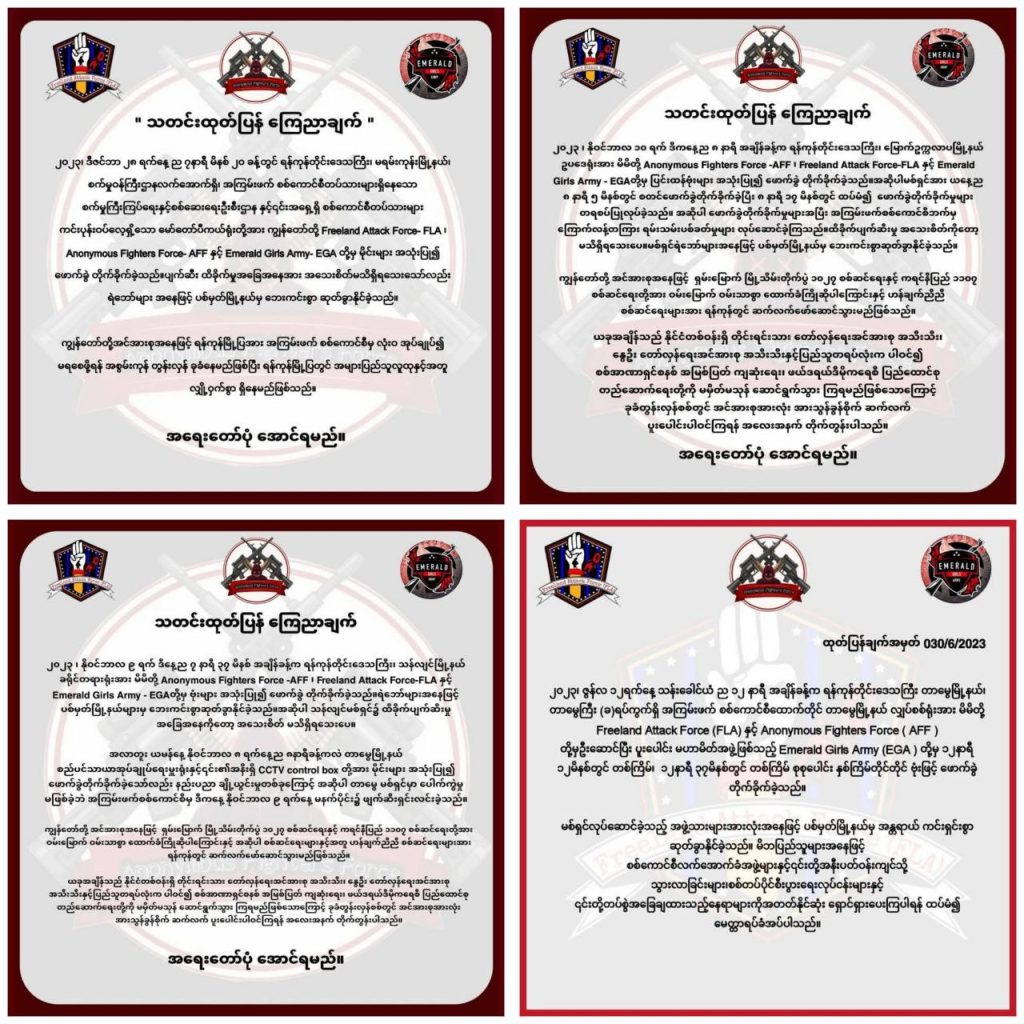 ဖြစ်စဉ်တွင် အကြမ်းဖက်လုပ်ကြံပစ်ခတ်မှုနှင့် မိုင်းထောင်ဖောက်ခွဲတိုက်ခိုက်မှုများကျူးလွန် ခဲ့သူ Free Land Attack Force (FLA) အမည်ခံ အကြမ်းဖက်အဖွဲ့ဝင်များဖြစ်ကြသော ကျော်ဇင်ဦး (ခ)ကျောင်းဆရာပါ ၄ ဦးတို့အားပြစ်မှုများကျူးလွန်စဉ် အသုံးပြုခဲ့သည့် ပစ္စတိုသေနတ် ၃ လက်၊ ကျည်မျိုးစုံ ၅၂ တောင့်၊ လက်ပစ်ဗုံး ၁ လုံး၊ မီးခိုးဗုံး ၂ လုံးတို့နှင့်အတူ ဖမ်းဆီးရမိခဲ့ပြီး ဥပဒေအရ ၎င်းတို့ကျူးလွန်ခဲ့သော ပြစ်မှုများအတိုင်း ထိရောက်စွာ အရေးယူနိုင်ရေး ဆက်လက်ဆောင်ရွက် သွားမည်ဖြစ်ကာ အကြမ်းဖက်မှုပြုလုပ်နေသူများအား ပြည်သူတစ်ရပ်လုံးက ဝိုင်းဝန်းကာကွယ် တိုက်ဖျက်ကြရန်နှင့် ဖမ်းဆီးရန်ကျန်တရားခံများအားအမြန်ဆုံးဆက်လက်ဖမ်းဆီးရမိရေးအတွက် ၎င်းတို့ ပုန်းခိုရာနေရာများ၊ လှုပ်ရှားသွားလာနေထိုင်မှု သတင်းများရရှိပါကသက်ဆိုင်ရာသို့ လျှို့ဝှက်စွာ သတင်းပေးတိုင်ကြားနိုင်ပါကြောင်းနှင့် မြို့၊ ရွာများအမြန်ဆုံးအေးချမ်းတည်ငြိမ်ရေးအတွက် ပြည်သူတစ်ရပ်လုံး ပူးပေါင်းပါဝင်ကြိုးပမ်းဆောင်ရွက်နိုင်ပါရန် မေတ္တာရပ်ခံအပ်ကြောင်း အသိပေးသတင်းထုတ်ပြန်ထားသည်။