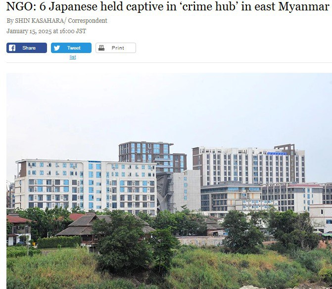 ထိုင်းနိုင်ငံနှင်နယ်စပ်ချင်းထိစပ်နေသော မြဝတီမြို့အနီး မြန်မာနိုင်ငံအရှေ့ပိုင်းရှိ အွန်လိုင်းမှ လိမ်လည်နေသည့် ဂိုဏ်းများလက်ထဲတွင် နိုင်ငံပေါင်း ၂၁ နိုင်ငံမှ လူပေါင်း ၆၀၀၀ ကျော် ဖမ်းဆီးထိန်းသိမ်းခံထားရဆဲဖြစ်ပြီး ဂျပန်နိုင်ငံသား အမျိုးသား ၅ ဦးနှင့် အမျိုးသမီး တစ်ဦးလည်း ဖမ်းဆီးခံရသူများထဲတွင် ပါဝင်နေကြောင်းပြောသည်။