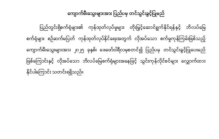ပြည်တွင်းရှိစက်ရုံများ၏ ကုန်ထုတ်လုပ်မှုများ တိုးမြှင့်ဆောင်ရွက်နိုင်ရန်နှင့် ဘိလပ်မြေစက်ရုံများ စဉ်ဆက်မပြတ် ကုန်ထုတ်လုပ်နိုင်ရေးအတွက် လိုအပ်သော စက်မှုကုန်ကြမ်းဖြစ်သည့် ကျောက်မီးသွေးများအား ၂၀၂၅ ခုနှစ်၊ ဖေဖော်ဝါရီလမှစတင်၍ ပြည်ပမှ တင်သွင်းခွင့်ပြုပေးမည် ဖြစ်ကြောင်းနှင့် လိုအပ်သော ဘိလပ်မြေစက်ရုံများအနေဖြင့် သွင်းကုန်လိုင်စင်များ လျှောက်ထားနိုင်ကြောင်း အသိပေးထားသည်။