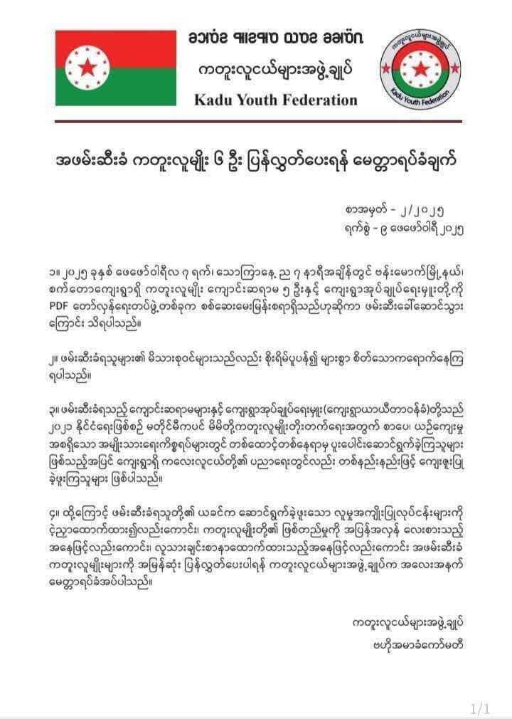ထို့ကြောင့် ဖမ်းဆီးခံရသူတို့၏ ယခင်က ဆောင်ရွက်ခဲ့ဖူးသော လူမှုအကျိုးပြုလုပ်ငန်းများကို ငဲ့ညှာထောက်ထား၍လည်းကောင်း၊ ကတူးလူမျိုးတို့၏ ဖြစ်တည်မှုကို အပြန်အလှန် လေးစားသည့် အနေဖြင့်လည်းကောင်း၊ လူသားချင်းစာနာထောက်ထားသည့်အနေဖြင့်လည်းကောင်း အဖမ်းဆီးခံ ကတူးလူမျိုးများကို အမြန်ဆုံး ပြန်လွှတ်ပေးပါရန် ကတူးလူငယ်များအဖွဲ့ချုပ်က အလေးအနက် မေတ္တာရပ်ခံအပ်ပါသည်ဟု KYF ၏ ထုတ်ပြန်ချက်တွင် ဖော်ပြထားသည်။