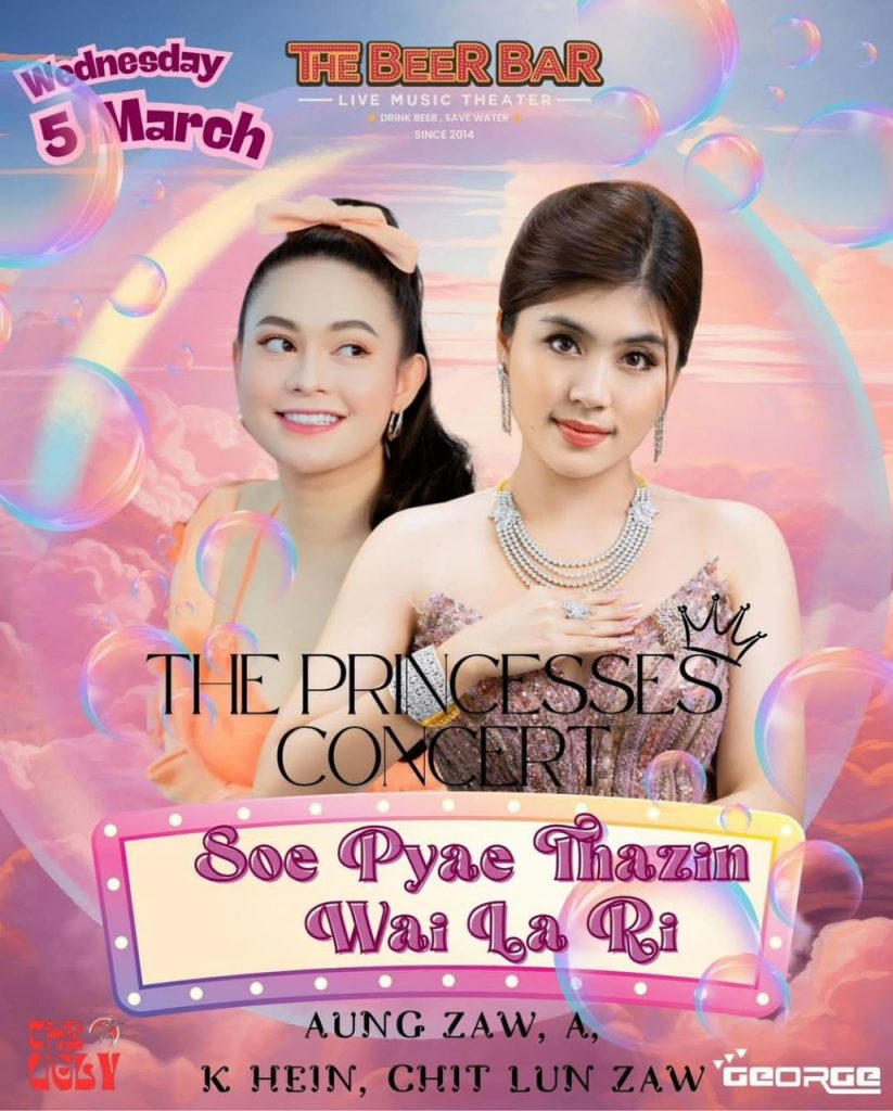 ဇာတ်လမ်းတွဲတွေကတစ်ဆင့် ပရိသတ်အားပေးမှုတွေ တကျော့ပြန် ထပ်မံရရှိလာတဲ့ သရုပ်ဆောင် ဝေလာရီနဲ့ စိုးပြည့်သဇင်တို့က လာမယ့် မတ်လ ၅ ရက်နေ့မှာ The Beer Bar မှာ The Princess Concert Show ပုံစံတေးသီချင်းတွေ သီဆိုဖျော်သွားဖို့ရှိပါတယ်လို့ ဆိုပါတယ်။