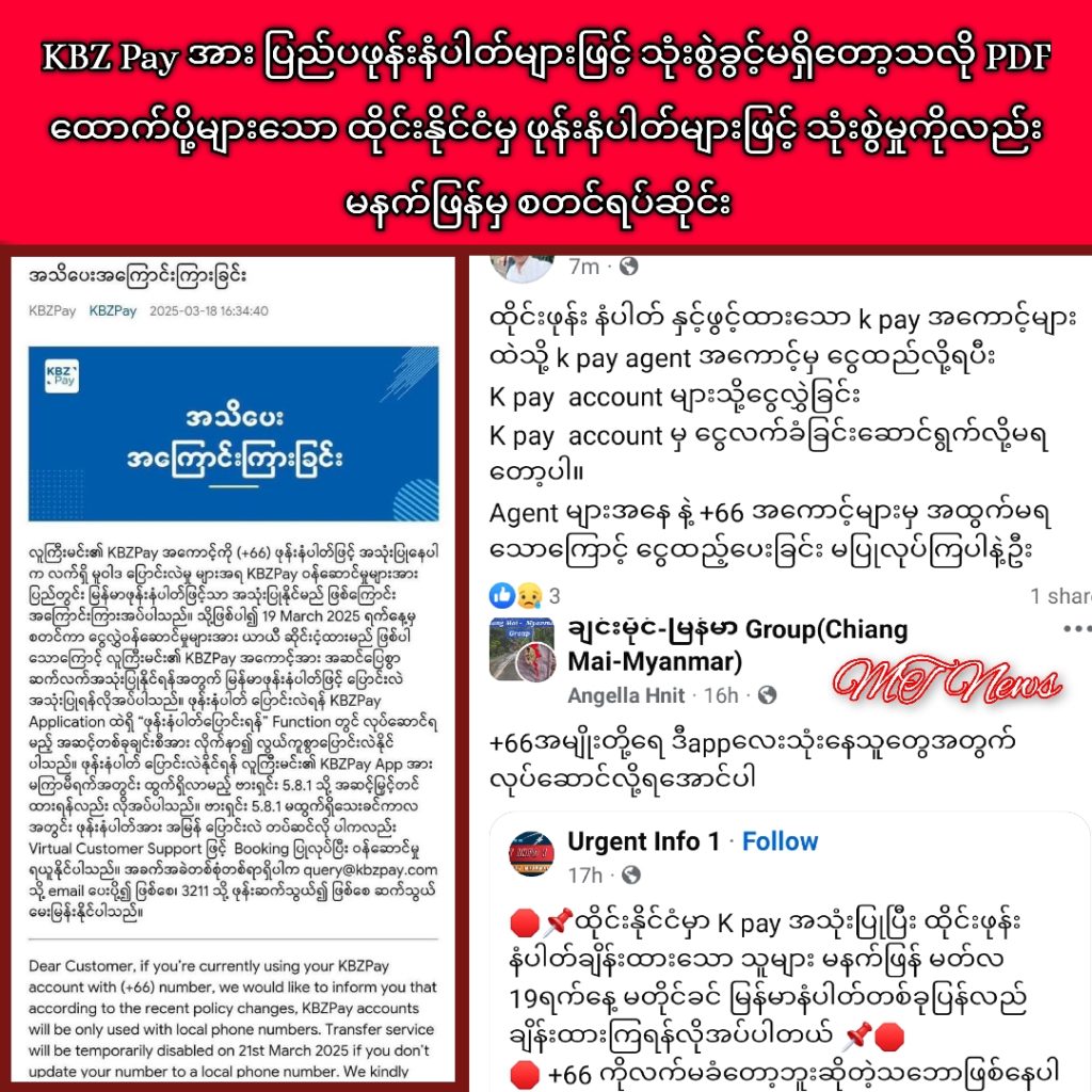 ယမန်နေ့ မတ်လ ၁၈ ရက်တွင် ထိုင်းဖုန်း +66 ဖြင့် KBZ Pay ဖွင့်လှစ်အသုံးပြုနေသော KBZ Pay သုံးစွဲသူများထံ KBZ Pay က”လူကြီးမင်း၏ KBZPay အကောင့်ကို (+66) ဖုန်းနံပါတ်ဖြင့် အသုံးပြုနေပါက လက်ရှိ မူဝါဒ ပြောင်းလဲမှုများအရ KBZPay ဝန်ဆောင်မှုများအား ပြည်တွင်း မြန်မာဖုန်းနံပါတ်ဖြင့်သာ အသုံးပြုနိုင်မည် ဖြစ်ကြောင်း အကြောင်းကြားအပ်ပါသည်။ သို့ဖြစ်ပါ၍ 19 March 2025 ရက်နေ့မှ စတင်ကာ ငွေလွှဲဝန်ဆောင်မှုများအား ယာယီ ဆိုင်းငံ့ထားမည် ဖြစ်ပါ သောကြောင့် လူကြီးမင်း၏ KBZPay အကောင့်အား အဆင်ပြေစွာ ဆက်လက်အသုံးပြုနိုင်ရန်အတွက် မြန်မာဖုန်းနံပါတ်ဖြင့် ပြောင်းလဲ အသုံးပြုရန်လိုအပ်ပါသည်။ ဖုန်းနံပါတ် ပြောင်းလဲရန် KBZPay Application ထဲရှိ “ဖုန်းနံပါတ်ပြောင်းရန်” Function တွင် လုပ်ဆောင်ရမည့် အဆင့်တစ်ခုချင်းစီအား လိုက်နာ၍ လွယ်ကူစွာပြောင်းလဲနိုင်ပါသည်။ ဖုန်းနံပါတ် ပြောင်းလဲနိုင်ရန် လူကြီးမင်း၏ KBZPay App အား မကြာမီရက်အတွင်း ထွက်ရှိလာမည့် ဗားရှင်း 5.8.1 သို့ အဆင့်မြှင့်တင်ထားရန်လည်း လိုအပ်ပါသည်။ ဗားရှင်း 5.8.1 မထွက်ရှိသေးခင်ကာလ အတွင်း ဖုန်းနံပါတ်အား အမြန် ပြောင်းလဲ တပ်ဆင်လို ပါကလည်း Virtual Customer Support ဖြင့် Booking ပြုလုပ်ပြီး ဝန်ဆောင်မှု ရယူနိုင်ပါသည်။ အခက်အခဲတစ်စုံတစ်ရာရှိပါက [email protected] သို့ email ပေးပို့၍ ဖြစ်စေ၊ 3211 သို့ ဖုန်းဆက်သွယ်၍ ဖြစ်စေ ဆက်သွယ် မေးမြန်းနိုင်ပါသည်။”ဟု မြန်မာလို ပေးပို့ခဲ့ပြီး အင်္ဂလိပ်စာဖြင့် ပေးပို့မှုတွင်မူ မြန်မာဖုန်းနံပါတ်သို့ မပြောင်းလဲပါက မတ်လ ၂၁ ရက်မှစတင်ကာ ငွေလွှဲဝန်ဆောင်မှုကို ယာယီပိတ်မည်ဟု အသိပေးခဲ့သည်။