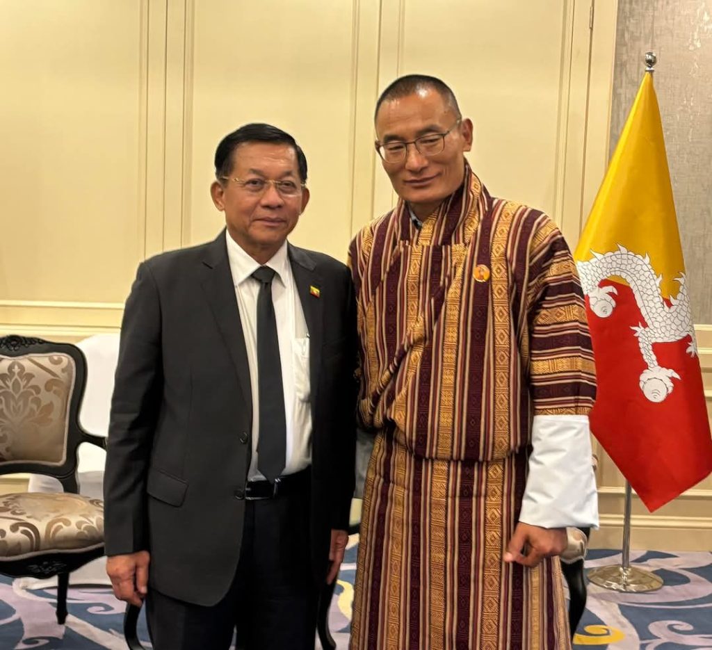 ထိုင်းနိုင်ငံက အိမ်ရှင်အဖြစ် လက်ခံကျင်းပသည့် ဆဋ္ဌမအကြိမ်မြောက် ဘင်းမ်စတက် ထိပ်သီးအစည်းအဝေး တက်ရောက်ခဲ့သော နိုင်ငံတော်စီမံအုပ်ချုပ်ရေးကောင်စီ (SAC) ဥက္ကဋ္ဌ ဗိုလ်ချုပ်မှူးကြီး မင်းအောင်လှိုင်နှင့် ဘူတန်နိုင်ငံဝန်ကြီးချုပ် H.E. Mr. Tshering Tobgay တို့သည် ယနေ့ ဒေသစံတော်ချိန် မွန်းလွဲပိုင်းတွင် ဘန်ကောက်မြို့ရှိ ShangriLa ဟိုတယ်၌ တွေ့ဆုံဆွေးနွေးခဲ့သည်။