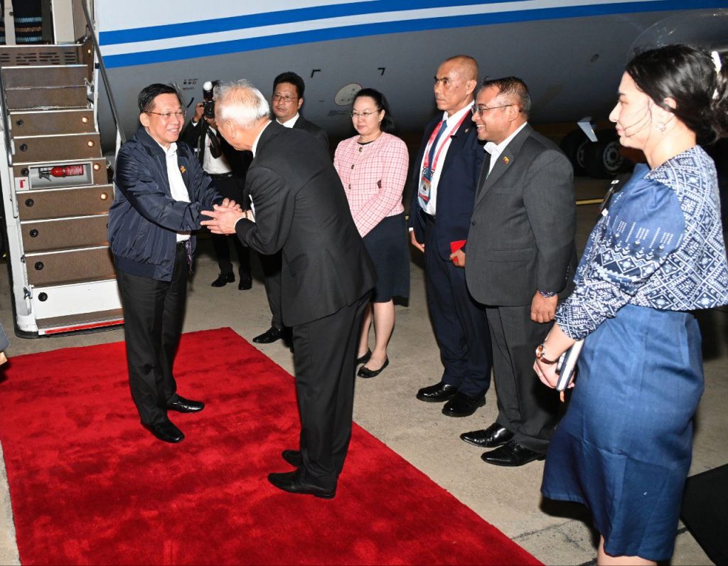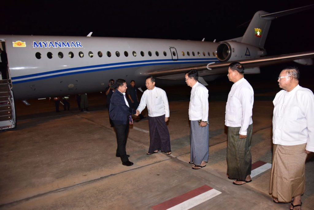 ထို့နောက် ည ၁၀ နာရီအချိန်တွင် နေပြည်တော် တပ်မတော်လေဆိပ်သို့ ရောက်ရှိကြရာ SAC ဒုတိယဥက္ကဋ္ဌ ဒုတိယဗိုလ်ချုပ်မှူးကြီး စိုးဝင်း၊ ကောင်စီအတွင်းရေးမှူး၊ ကောင်စီဝင်များ၊ ပြည်ထောင်စုဝန်ကြီးများ၊ ညှိနှိုင်းကွပ်ကဲရေးမှူး (ကြည်း၊ရေ၊လေ)နှင့် ကာကွယ်ရေးဦးစီးချုပ်ရုံးမှ အဆင့်မြင့်တပ်မတော် အရာရှိကြီးများ၊ နေပြည်တော်တိုင်းစစ်ဌာနချုပ်တိုင်းမှူး၊ မြန်မာနိုင်ငံဆိုင်ရာ ထိုင်းနိုင်ငံသံအမတ်ကြီးတို့က လေဆိပ်၌ ကြိုဆိုနှုတ်ဆက်ခဲ့ကြသည်။