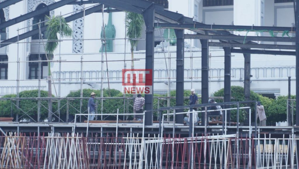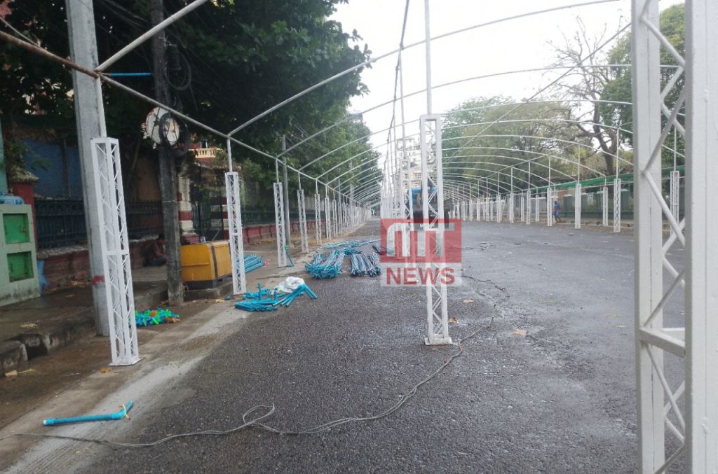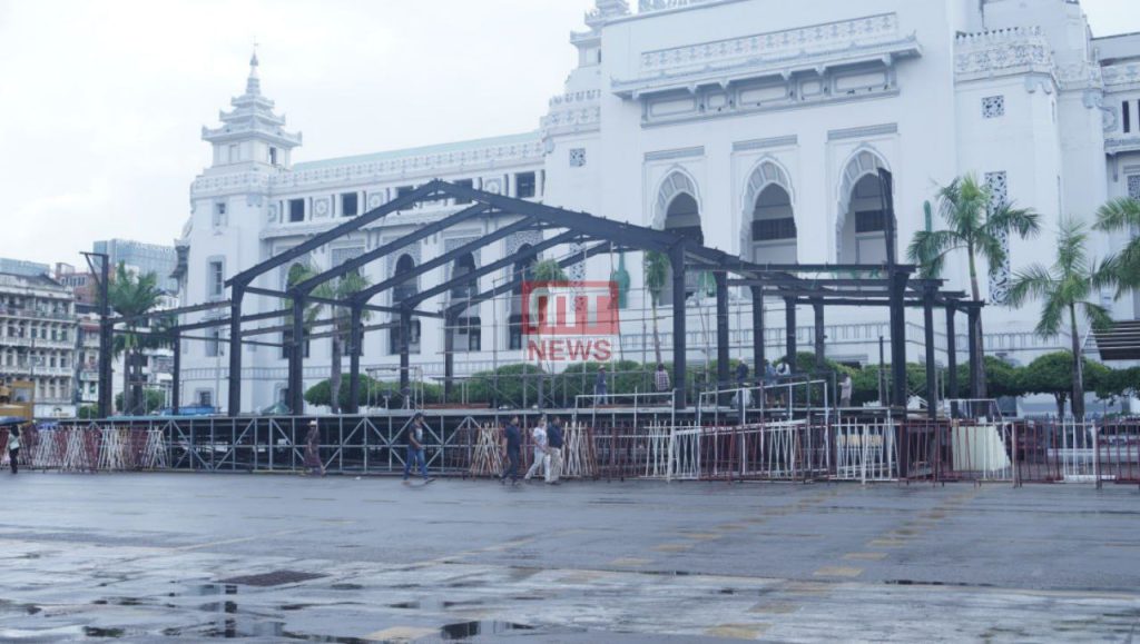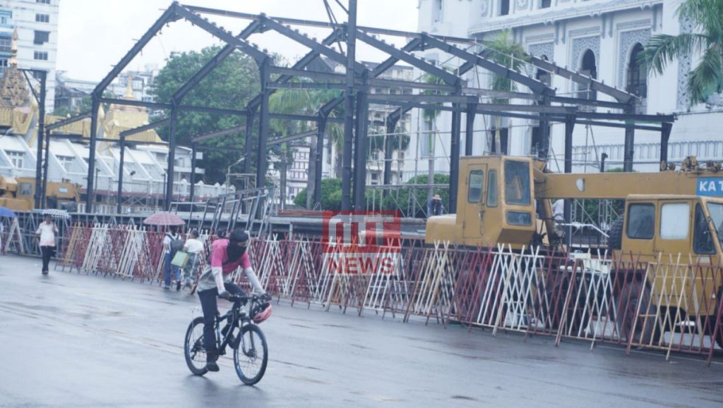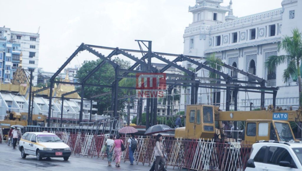 ရန်ကုန်မြို့တော်ခန်းမရှေ့မှာ ပြုလုပ်မယ့် ဗဟိုရေကစားမဏ္ဍပ်နဲ့ လမ်းလျှောက်သင်္ကြန်အတွက် ပြင်ဆင်ထားမှုတွေကို ဆက်လက်မလုပ်ဆောင်တော့ဘဲ ပြန်လည်ဖျက်သိမ်းနေတာကို ဒီနေ့မှာ တွေ့ရပါတယ်။