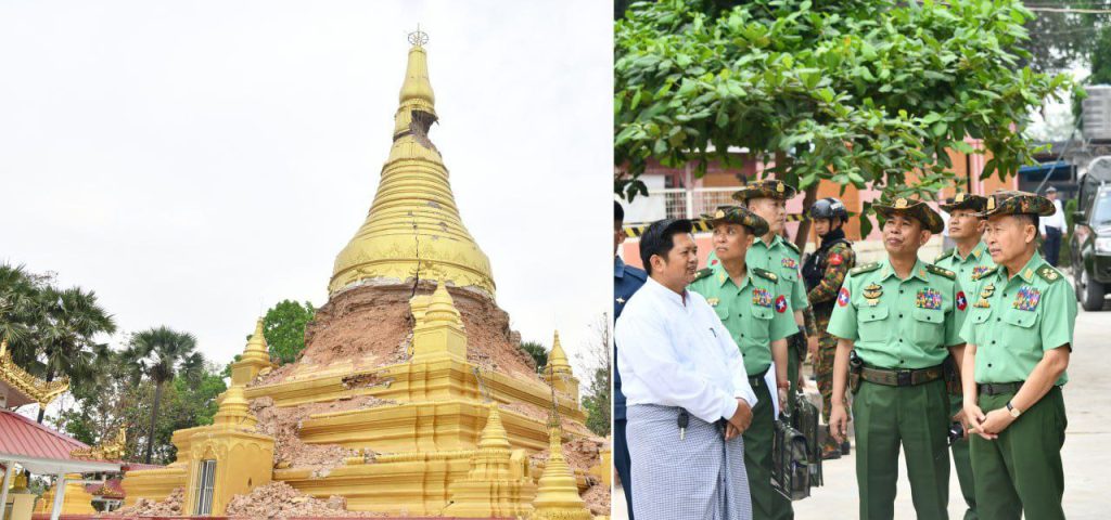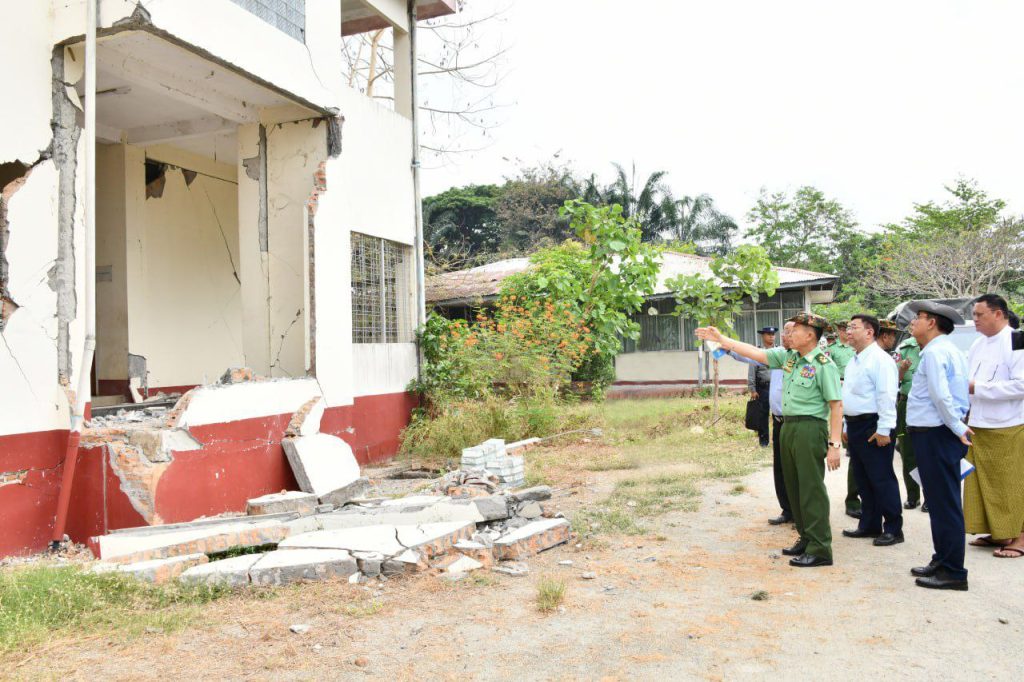 အမျိုးသားသဘာဝဘေး အန္တရာယ်ဆိုင်ရာစီမံခန့်ခွဲမှု ကော်မတီဥက္ကဋ္ဌ နိုင်ငံတော် စီမံအုပ်ချုပ်ရေးကောင်စီဒုတိယဥက္ကဋ္ဌ ဒုတိယဝန်ကြီးချုပ် ဒုတိယဗိုလ်ချုပ်မှူးကြီး စိုးဝင်း သည် ပြည်ထောင်စုဝန်ကြီးများ၊ ကာကွယ်ရေးဦးစီးချုပ်ရုံးမှ တပ်မတော်အရာရှိကြီးများ၊ ဒုတိယဝန်ကြီးများနှင့် တာဝန်ရှိသူများလိုက်ပါ၍ ယမန်နေ့နံနက်ပိုင်းတွင် ပဲခူးတိုင်းဒေသကြီးသို့ သွားရောက်ကာ ငလျင်ဒဏ်ကြောင့် ထိခိုက်ပျက်စီးဆုံးရှုံးခဲ့ရမှုအခြေအနေများ၊ ပြန်လည်ပြုပြင် ရေးလုပ်ငန်းများ ဆောင်ရွက်နေမှုနှင့် ငလျင်ဒဏ်ကြောင့် ထိခိုက်ဒဏ် ရာရရှိ သူများအား ကျန်းမာရေးစောင့်ရှောက်မှုပေးနေမှုကို ကြည့်ရှုစစ်ဆေးပြီး လိုအပ် သည်များကို လမ်းညွှန် မှာကြားသည်။
