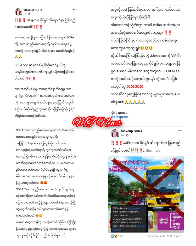 အဆိုပါဖြစ်စဥ်ကို ဧပြီ ၇ ရက်နေ့တွင် Makep SORA Page မှ “JJ Express ပိုင်ရှင် ထိရောက်စွာ ပြန်လည်ဖြေရှင်းပေးပါ” ခေါင်းစဥ်ဖြင့် ပို့စ်တင်ခဲ့ပြီး “SORA Team က ညီမလေးတွေအားလုံး ခြောက်ယောက် အင်းလေးငလျင်ဘေး အလှု လုပ်ပြီးအပြန် JJ Express နဲ့ ရန်ကုန်ကိုလာပါတယ်။ လာနေရင်းနဲ့ မနက် ၄ နာရီ လူတွေအကုန်လမ်းမှာ ကားရပ်ပြီးအိပ်နေတဲ့အချိန်မှာ မိုက်ရိုင်းစွာနဲ့ စပါယ်ယာဆိုတဲ့အကောင်တစ်ကောင်က SORA team က ညီမလေး တစ်ယောက်အိပ်နေချိန် သူ့လက်နဲ့ မိန်းကလေး Privacy နေရာကို အောက်တန်းကျစွာဖြင့်လာကိုင်ပါတယ်။ SORA Team က ညီမလေးလည်း အသံကျယ်ကျယ် သူ့ကိုအော်ပြီး ဘာလုပ်တာလဲ ငါမအိပ်သေးဘူးနော်လို့ပြောတော့ မသိသလိုနဲ့ ကျွန်တော် စပါယ်ရာလေဆိုပြီးသူမဟုတ်သလိုနဲ့ လုပ်သွားတာတော်တော်ရွံဖို့ကောင်းပါတယ်” ဟုဆိုကာ JJ Express မှ ကျူးလွန်သူကို အရေးယူပေးရန် တောင်းဆိုခဲ့သည်။