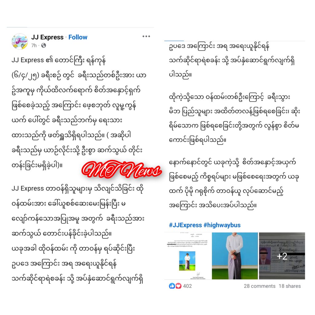 ထိုဖြစ်စဥ်အပေါ် JJ Express ကလည်း ယမန်နေ့ည သန်းခေါင်အချိန်တွင် “JJ Express ၏ တောင်ကြီး ရန်ကုန် (၆/၄/၂၅) ခရီးစဉ်တွင် ခရီးသည်တစ်ဦးအား ယာဥ်အကူမှ ကိုယ်ထိလက်ရောက် စိတ်အနှောင့်အယှက် ဖြစ်စေခဲ့သည့် အကြောင်း ဖေ့စ်ဘုတ် လူမူ့ကွန်ရက် ပေါ်တွင် ခရီးသည်ဘက်မှ ရေးသားထားသည်ကို ဖတ်ရှူသိရှိရပါသည်။ ( အဆိုပါ ခရီးသည်မှ ယာဉ်လိုင်းသို့ ဦးစွာ ဆက်သွယ် တိုင်းတန်းခြင်းမရှိခဲ့ပါ)။ JJ Express တာဝန်ရှိသူများမှ သိလျင်သိခြင်း ထိုဝန်ထမ်းအား ခေါ်ယူစစ်ဆေးမေးမြန်းပြီး မလျော်ကန်သောအပြုအမူ အတွက် ခရီးသည်အား ဆက်သွယ် တောင်းပန်ခိုင်းခဲ့ပါသည်။ ယခုအခါ ထိုဝန်ထမ်းကို တာဝန်မှ ရပ်ဆိုင်းပြီး ဥပဒေကြောင်းအရ အရေးယူနိုင်ရန် သက်ဆိုင်ရာရဲစခန်းသို့ အပ်နှံဆောင်ရွက်လျက်ရှိပါသည်။ ထိုကဲ့သို့သော ဝန်ထမ်းတစ်ဦးကြောင့် ခရီးသွား မိဘ ပြည်သူများ အထိတ်တလန့်ဖြစ်ရစေခြင်း၊ စိုးရိမ်သောက ဖြစ်ရစေခြင်းတို့အတွက် လွန်စွာ စိတ်မကောင်းဖြစ်ရပါသည်။ နောက်နောင်တွင် ယခုကဲ့သို့ စိတ်အနှောင့်အယှက်ဖြစ်စေမည့် ကိစ္စရပ်များ မဖြစ်စေရေးအတွက် ယခုထက် ပိုမို ဂရုစိုက် တာဝန်ယူ လုပ်ဆောင်မည့်အကြောင်း အသိပေးအပ်ပါသည်” ဟု ဖော်ပြတောင်းပန်ခဲ့သည်။